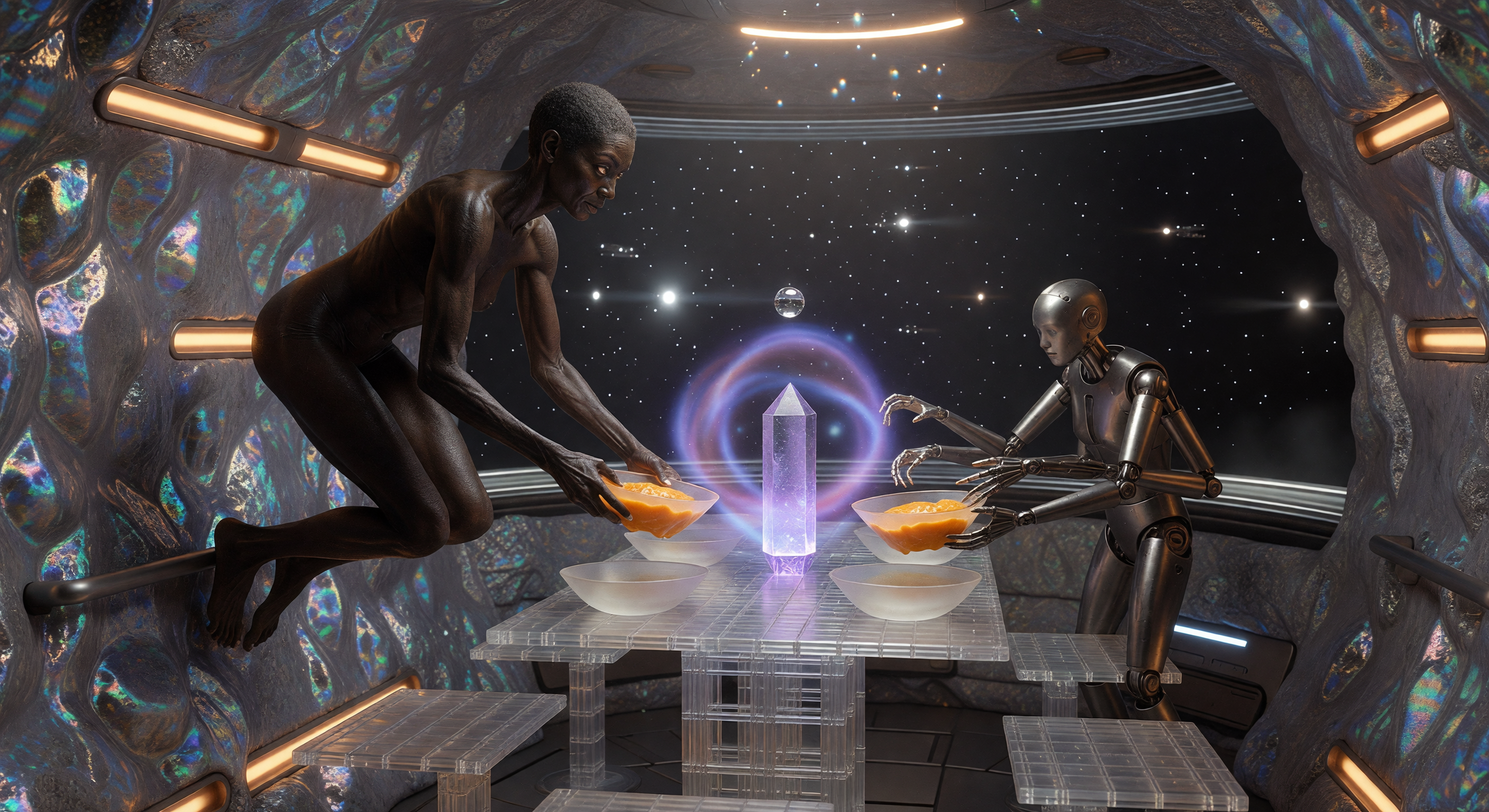 Het beeld communiceert effectief het kernconcept van een gedeelde maaltijd tussen post-humanen entiteiten binnen een holle asteroïde. De iriserende, metalen grot muren suggereren overtuigend het interieur van 16 Psyche, een nikkel-ijzeren asteroïde, en de transparante aerogel-achtige tafel en stoelen zijn een mooi speculatief designelement. Het kristallen middelpunt met zijn draaikolkende AR-aura vertegenwoordigt plausibel de visualisatie van het bewustzijn van de Silicate-entiteit. De robotfiguur aan de rechterkant wordt duidelijk gelezen als de 'Exo' in een robotmouw. De kommen met saffraankleurige voedingspasta zijn een goede visuele verankering die de scène verbindt met het culturele detail van het bijschrift. Er zijn echter verschillende punten die het vermelden waard zijn. Ten eerste beschrijft het bijschrift drie entiteiten (Litho-Sapiens, Exo en Silicate), maar de afbeelding toont duidelijk slechts twee figuren — de humanoïde links en de robot rechts — waarbij de kristal mogelijk de Silicate vertegenwoordigt. Deze discrepantie moet worden aangepakt. Ten tweede lijkt de figuur aan de linkerkant een standaard (hoewel ongewoon gespierd) mens te zijn in plaats van een overtuigend 'bio-engineered Litho-Sapiens', wat men zou verwachten, en zou radicalere biologische aanpassingen voor leven op een asteroïde moeten tonen, zoals een dichtere botstructuur, stralingsbestendige huid, of mineralen-geïntegreerde kenmerken. Ten derde, hoewel de setting met lage zwaartekracht wordt gesuggereerd door de zwevende houding van de figuur, liggen de kommen met pasta vlak en stabiel op de tafel alsof er normale zwaartekracht is, en de beloofde 'hangende bol van gerecycled water' is niet duidelijk zichtbaar—er is een kleine transparante bol die op de achtergrond zweeft, maar het is ambigu. De grote open uitzicht op de ruimte is dramatisch maar roept vragen op over de structurele plausibiliteit voor een onder druk staande habitat binnen een asteroïde.