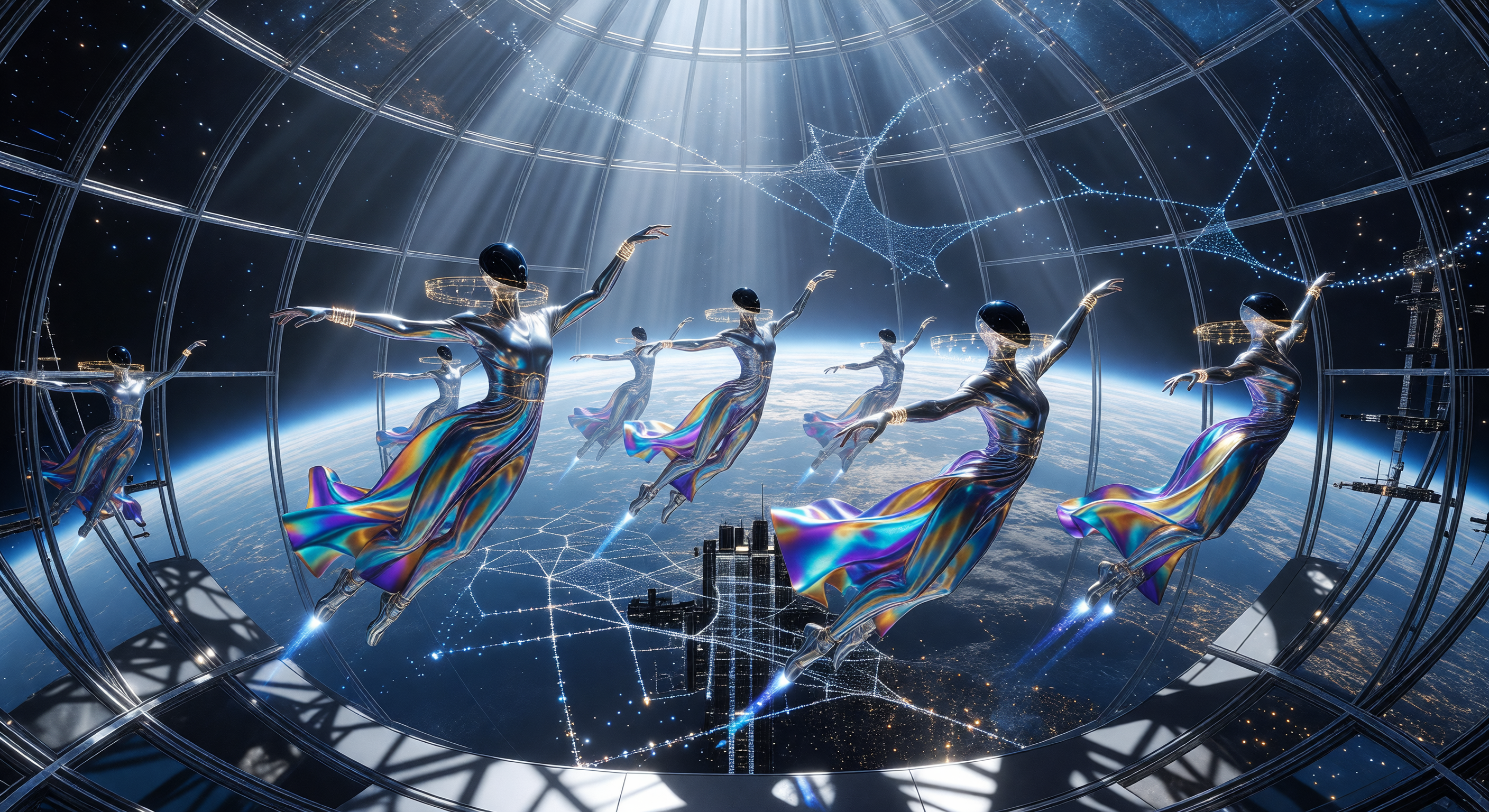IMAGE issues identified by the committee: 1. The flowing, billowing fabric behaves like it is in gravity or wind, which is physically inconsistent for true microgravity. 2. The dancers’ poses and costume movement read more like Earth-gravity ballet than zero-g choreography. 3. The luminous geometric patterns are not clearly Voronoi tessellations; they look more like node-and-edge network graphs, Delaunay-like triangulations, or particle/data meshes. 4. No distinct ion-plasma micro-thruster hardware is visible. 5. No clearly identifiable ionized gas plumes are visible. 6. The orbital elevator/lattice backdrop is only faintly or ambiguously suggested, not clearly established. 7. The image implies a black helmet-like head/ocular effect, but it does not unambiguously show the specific 'obsidian ocular sensors' described in the caption. 8. The architecture is coherent, but the linkage between the theater structure and the orbital megastructure infrastructure could be made more explicit.