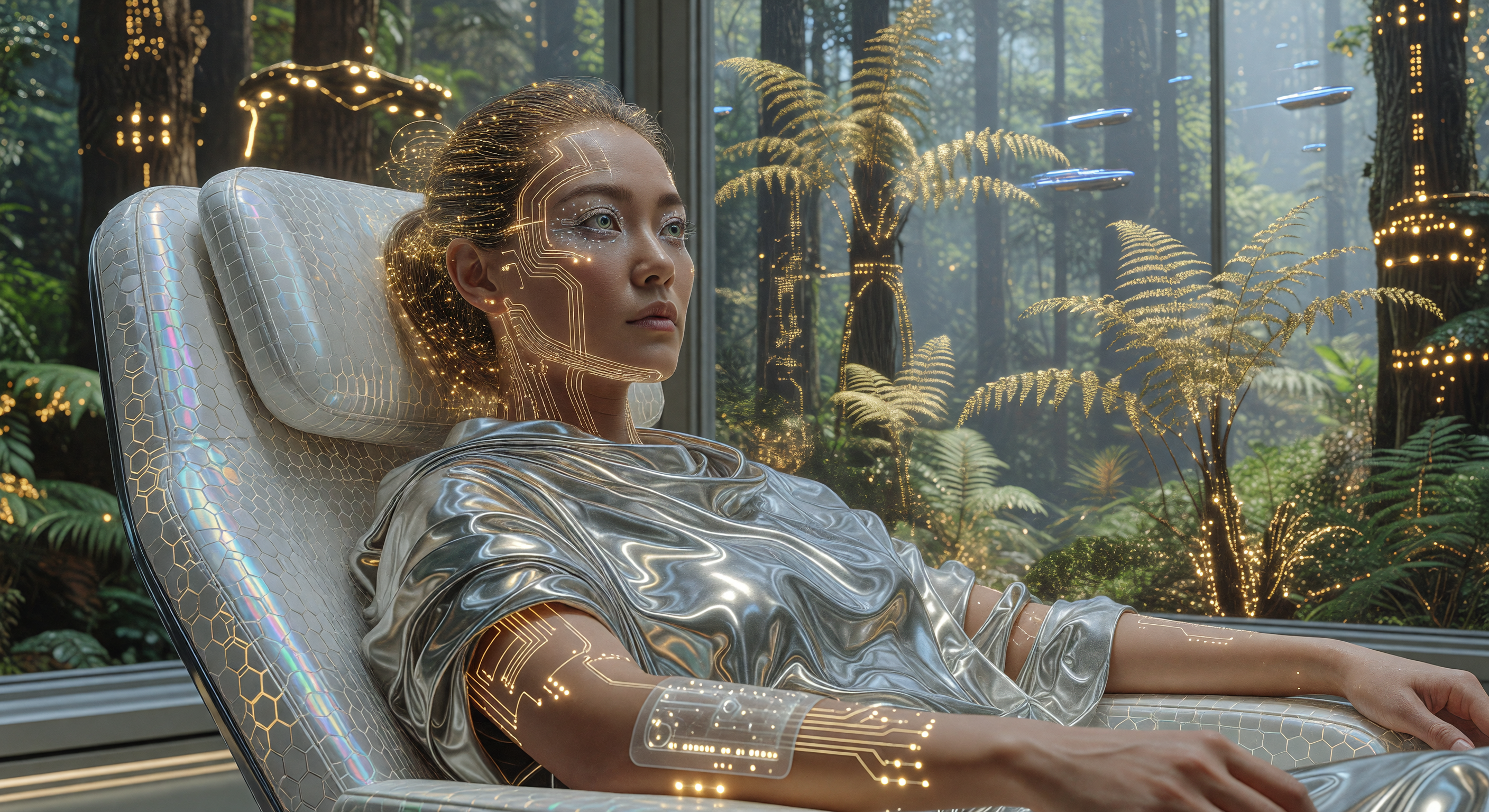 The image presents a visually compelling and internally coherent depiction of a highly augmented human in a speculative future setting. The gold circuit-trace patterns visible on the subject's face, neck, and arms are a strong visual correlate for sub-dermal circuitry. The liquid-metal shroud reads convincingly as an adaptive material garment. The chair features a distinctive hexagonal/honeycomb texture that, while not explicitly 'graphene,' communicates advanced materials engineering effectively. The forest background is richly detailed with ferns and tall trees, and crucially, the golden luminous tracery overlaid on the vegetation — combined with the floating disc-shaped craft visible through the glass — strongly supports the CMR overlay reading and distinguishes it from simply being a window onto nature. This is a more generous interpretation than my GPT colleague offered; the golden tonal quality of the forest and the embedded light nodes do visually differentiate the CMR overlay from unmediated reality. However, I agree with GPT that the high-altitude arcology context and any exterior city sprawl are entirely absent. The setting reads as an interior pod or conservatory with no suggestion of vertical urban infrastructure or orbital energy systems.