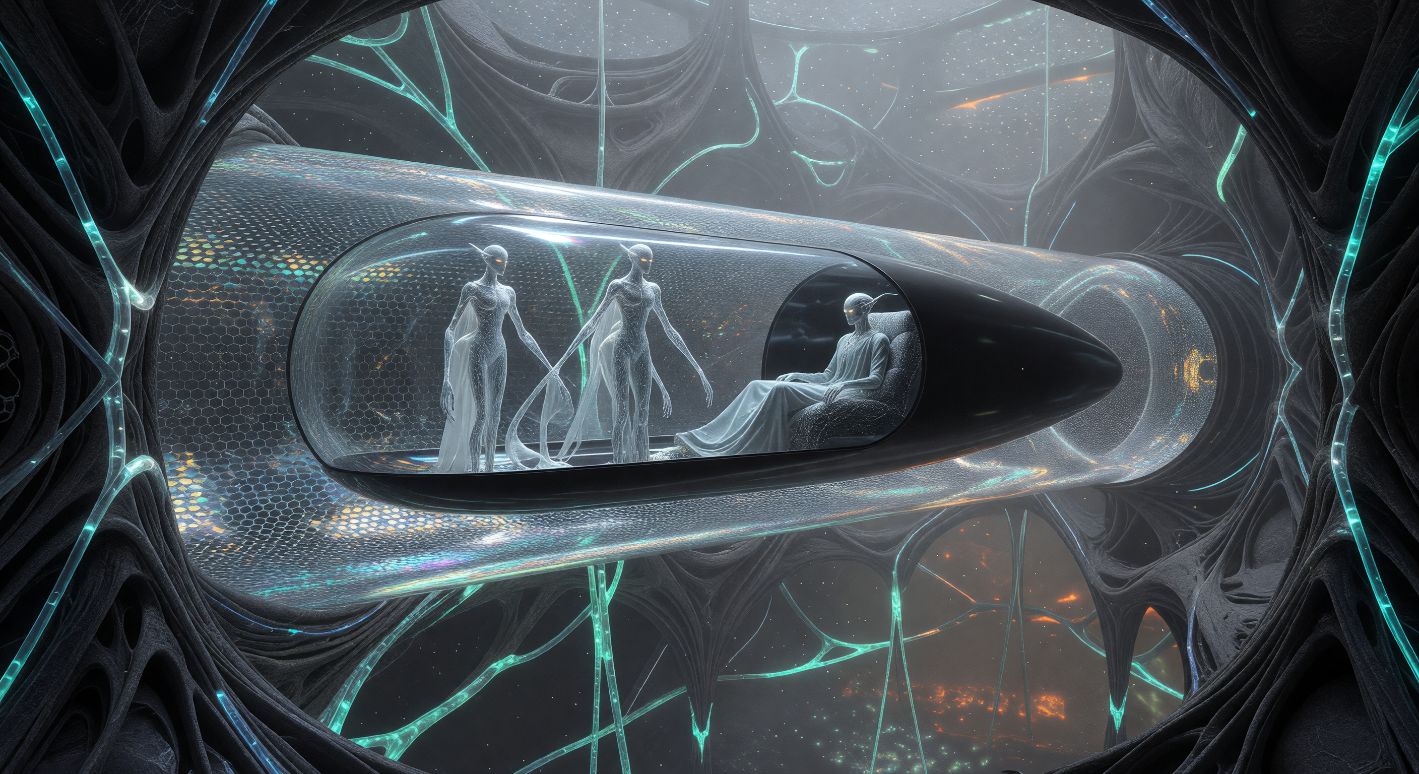 Gelegen op vijftig kilometer diepte in de bovenmantel onthult dit beeld een transit-knooppunt uit het tijdperk van de Horizon (100.000 – 1.000.000 n.Chr.), een periode waarin de grens tussen technologie en geologie is vervaagd. Een monolithische maglev-pod glijdt nagenoeg wrijvingsloos door een vacuümbuis van grafeen, omgeven door wanden van zelfherstellend Levend Basalt en pulserende hydrologische aderen die koelvloeistof door de aardkorst pompen. Binnenin zijn post-biologische bewoners zichtbaar—drie meter lange, kwartsachtige entiteiten die getuigen van een verre toekomst waarin de mensheid is opgegaan in een stabiel en technologisch geoptimaliseerd planetair ecosysteem.