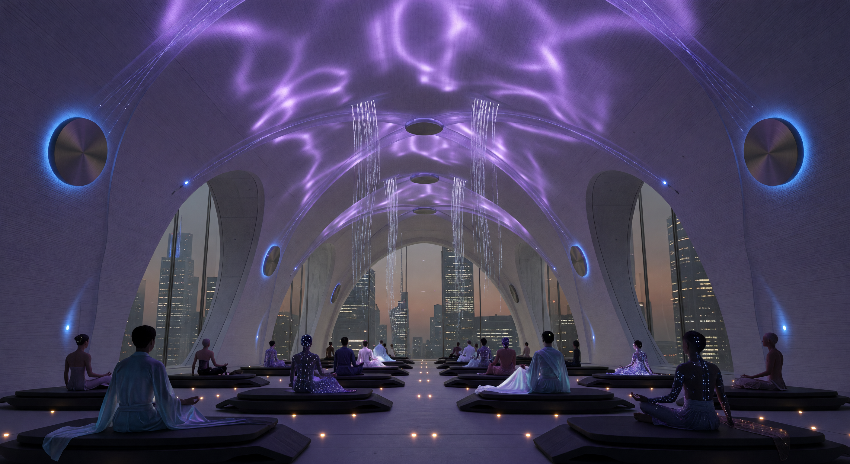 Paragraph 1: The committee agrees that the core concept is strong and broadly accurate as speculative late-21st-century architecture. The image coherently depicts a techno-spiritual interior with a cathedral-like vaulted nave, parametric/organic arches, embedded lighting, meditating occupants, and a dense East Asian megacity skyline that plausibly supports a futuristic 'Neo-Tokyo' setting. Reviewers also agree that the scene is not anachronistic for c. 205–210 and plausibly extends current trends in parametric, biomimetic, and immersive architectural design.