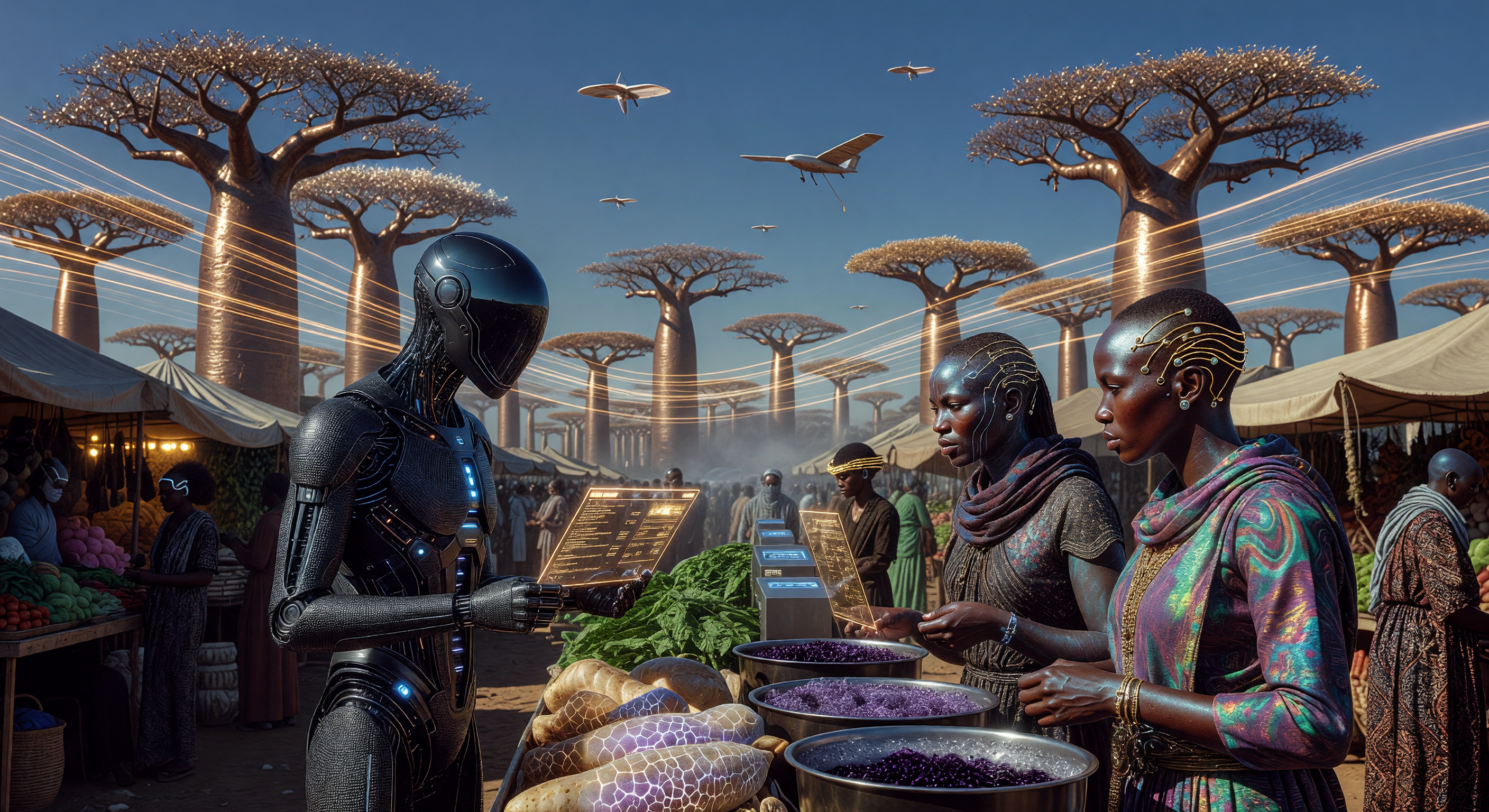De afbeelding is een overtuigende en grotendeels coherente weergave van een Sahelische marktplaats in de nabije toekomst. De culturele verankering is redelijk sterk: de openluchtmarktkramen met canvas overkappingen, het zanderige terrein, de kleurrijke textiel met patronen die door de handelaren wordt gedragen, en de aanwezigheid van baobabbomen roepen de Sahelregio allemaal op overtuigende wijze op. De twee augmented handelaren met zichtbare craniale neurale-linkinterfaces vormen een fraaie speculatieve toevoeging die hedendaagse Afrikaanse esthetiek verbindt met plausibele augmentatie in de nabije toekomst. De humanoïde synthetische entiteit is goed weergegeven, en de donkere, grafeenachtige oppervlaktestructuur sluit aan bij de beschrijving in het bijschrift van een ‘biomimetisch grafeen-roosterchassis’. De translucente, fractaal gepatroneerde knollen op de voorgrond zijn zichtbaar en komen overeen met de beschrijving in het bijschrift van met CRISPR geoptimaliseerde opbrengsten. Er zijn echter enkele duidelijke problemen: de baobabbomen lijken nauwer gemodelleerd op Grandidiers baobab (Adansonia grandidieri), die endemisch is voor Madagaskar, en niet voor de Sahel. De Sahelische soort zou Adansonia digitata zijn, die een duidelijk andere, meer bolvormige en onregelmatige vorm heeft. Dit is een betekenisvolle botanische/geografische fout. Daarnaast hebben de bomen een enigszins metaalachtige of kunstmatig gepolijste glans, waardoor ze synthetisch in plaats van organisch ogen, wat in tegenspraak is met de kadering in het bijschrift van een herwonnen levend ecosysteem, tenzij het de bedoeling is dat dit bio-geëngineerde exemplaren zijn — in dat geval zou het bijschrift dit moeten verduidelijken.
