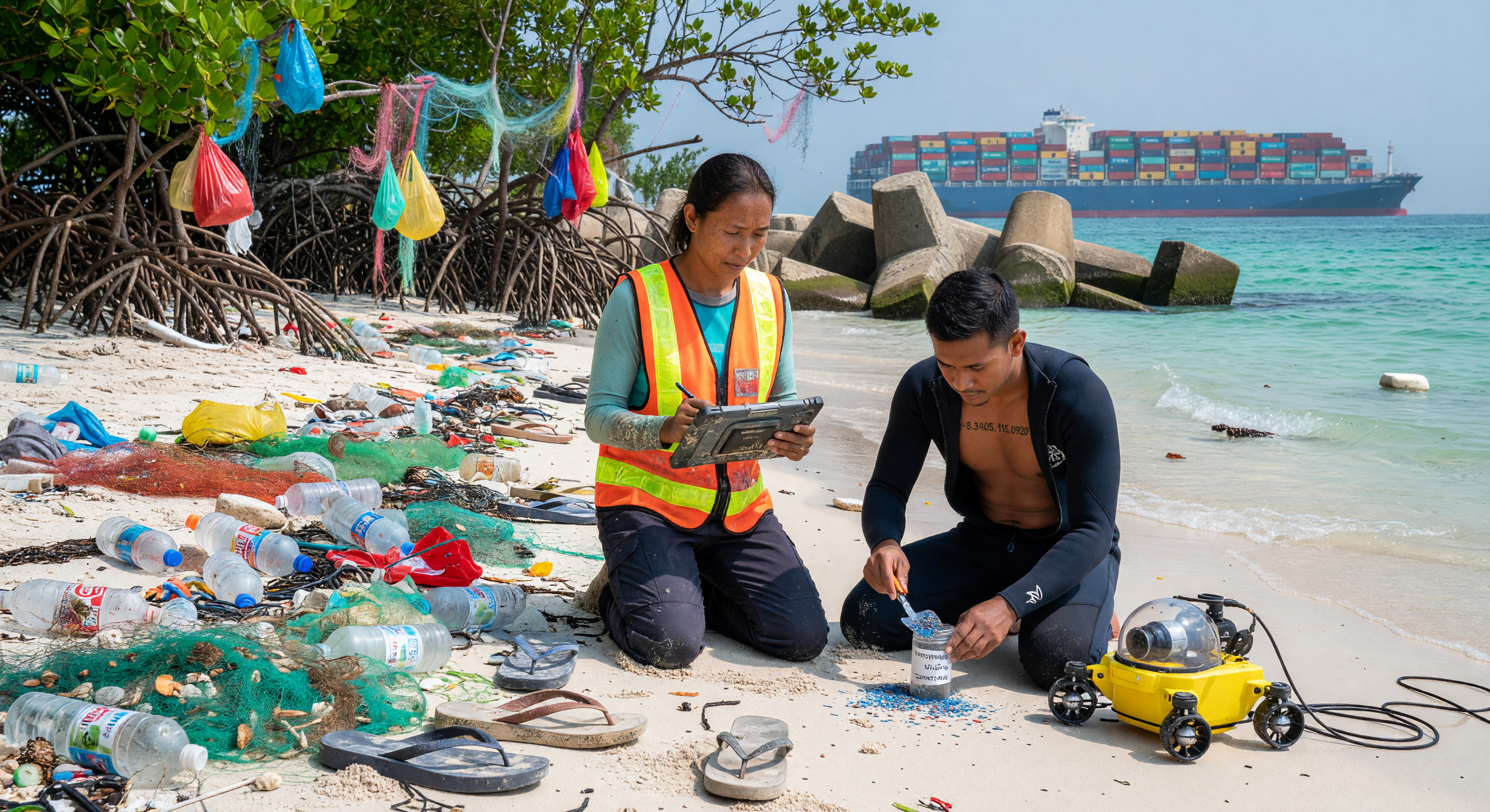 - 한국어: 인도네시아 해변에서 미세 플라스틱 오염을 조사하는 연구원들