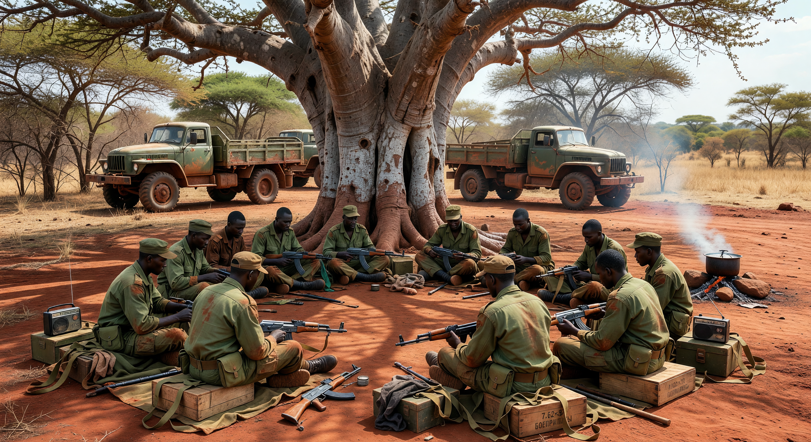 De afbeelding vangt effectief een historisch plausibel tafereel van FAPLA-soldaten in de late jaren '70 in Angola. De centrale baobabboom (Adansonia digitata) is iconisch en nauwkeurig voor de savannelandschappen van de provincie Cuando Cubango, correct gepaard met de rode laterietbodem die kenmerkend is voor de ijzerrijke oxisols van de regio. Soldaten dragen daartoe passende olijfkleurige uniformen, borstbanden en kepi-stijl hoeden, consistent met de door de Sovjetunie geleverde MPLA-strijders; AK-47/AKM geweren zijn perfect weergegeven, getoond in verschillende stadia van schoonmaken met olie doeken en stangen. Op de voorgrond voegen in Cyrillisch gestempelde kisten ('7.62' en 'БОЕПРИПАСЫ') en houten munitiekisten authentieke details toe, evenals de Ural-375D-achtige 6x6-trucks op de achtergrond, die inderdaad zwaar door de USSR aan de FAPLA-logistiek zijn geleverd. De acacia's op de achtergrond en de droge savanne-vegetatie passen bij de aride omgeving van Cuando Cubango. Kleine AI-artifacten (bijv. iets uniforme gelaatstrekken) en een enigszins geënsceneerde netheid zijn aanwezig, maar doen geen afbreuk aan de algehele visuele coherentie of introduceren anachronismen; soldaten lijken sterk genoeg voor een onderhouds pauze, met stof op hun laarzen en uitrusting. Er zijn geen significante historische, culturele of wetenschappelijke onjuistheden - geologie (lateriet), biologie (flora) en technologie (Sovjet-wapens/voertuigen) zijn allemaal correct voor de periode.