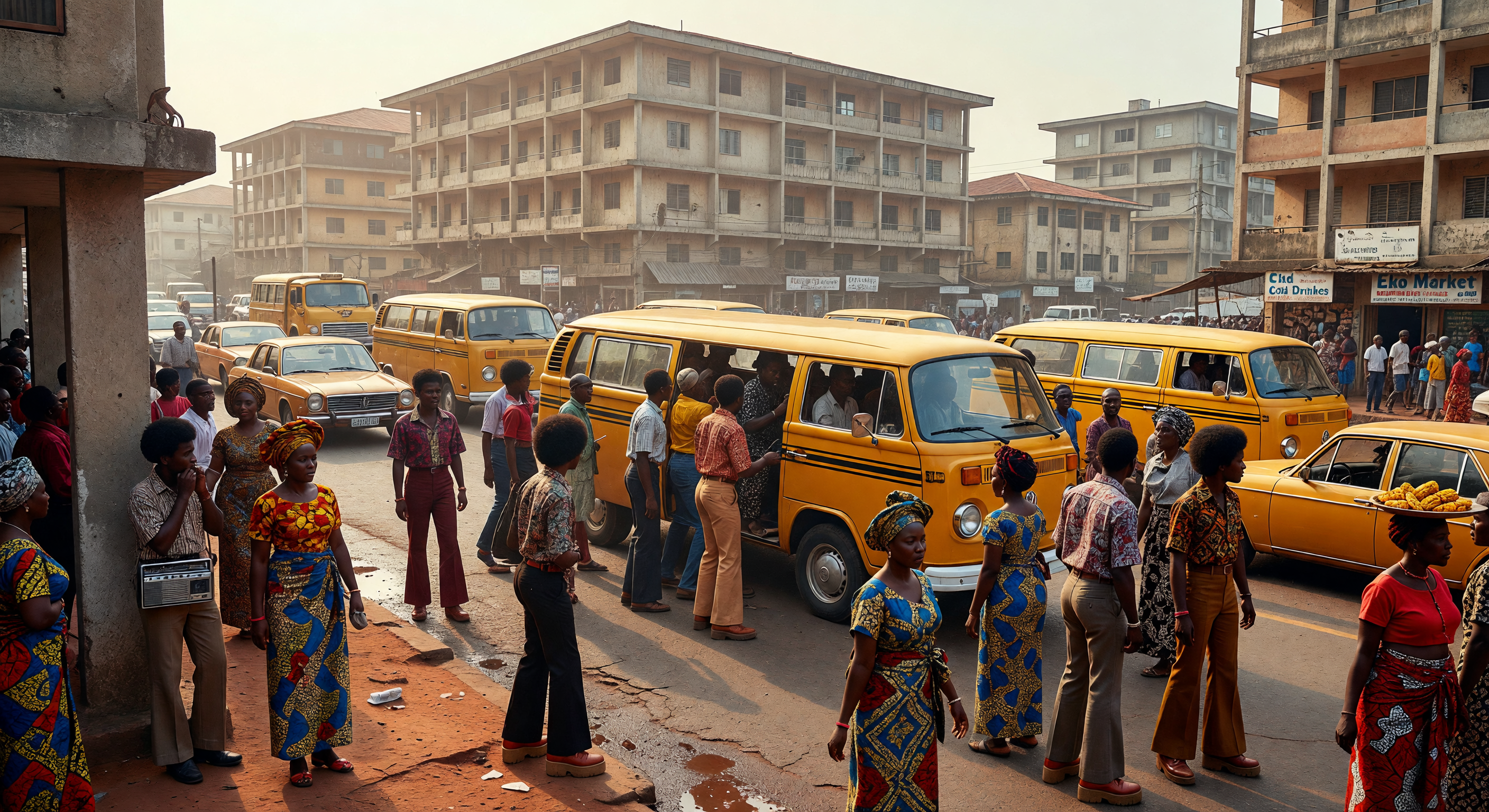 De afbeelding vangt Lagos in de jaren '70 uitstekend met hoge historische en culturele nauwkeurigheid. Iconische gele Volkswagen Type 2 'Danfo' bussen domineren het beeld, die correct worden weergegeven als de belangrijkste openbare vervoersmiddel in Nigeria's stedelijke centra tijdens de olieboom. De kleding is precies goed: vrouwen in levendige Ankara-waxprint wrappers (gele hoofdsieraden en iro-buba stijlen) gecombineerd met mannen in bell-bottom broeken, afro's en platform schoenen, wat de fusie van Yoruba tradities en wereldwijde disco-invloeden weerspiegelt. Tropische modernistische architectuur - brutale betonnen middenhoogte gebouwen met diepe balkons voor schaduw en ventilatie - is nauwkeurig voor de ontwikkelingen in Lagos na de onafhankelijkheid, zoals die van bedrijven die door Maxwell Fry en Jane Drew zijn beïnvloed. Details zoals de boombox (draagbare cassette-spelers die populair waren in het midden van de jaren '70), gele VW Beetle taxi's, het bord 'Eko Market' (Eko is Yoruba voor Lagos) en de vage tropische stof/pollutie verhogen de authenticiteit zonder anachronismen. Geen moderne elementen (bijv. smartphones, SUV's) verschijnen; de drukke verkeersopstopping cohesioneert visueel met de snelle verstedelijking. Wetenschappelijk gezien zijn de rode lateritische bodemvlekken en tropische flora regionaal nauwkeurig.