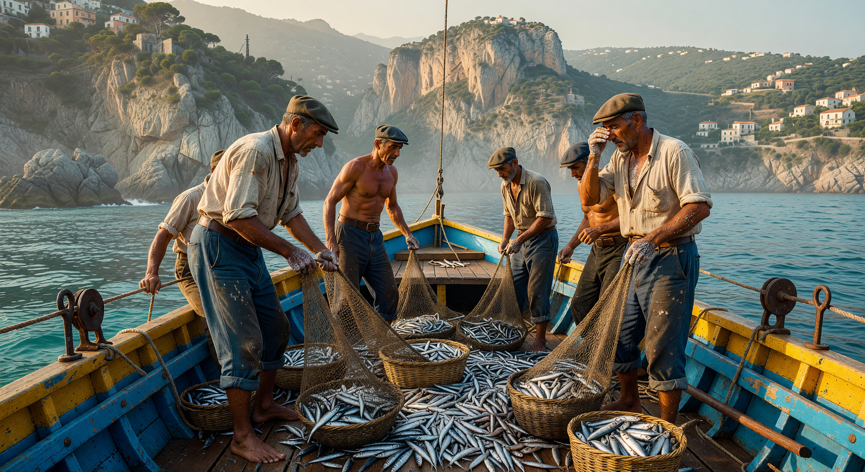 Gezien de onnauwkeurigheden met betrekking tot de afbeelding, is een aanpassing nodig om het nauwer af te stemmen op de historische en regionale realiteiten van de Amalfi-kust en de visserijpraktijken van 1952.