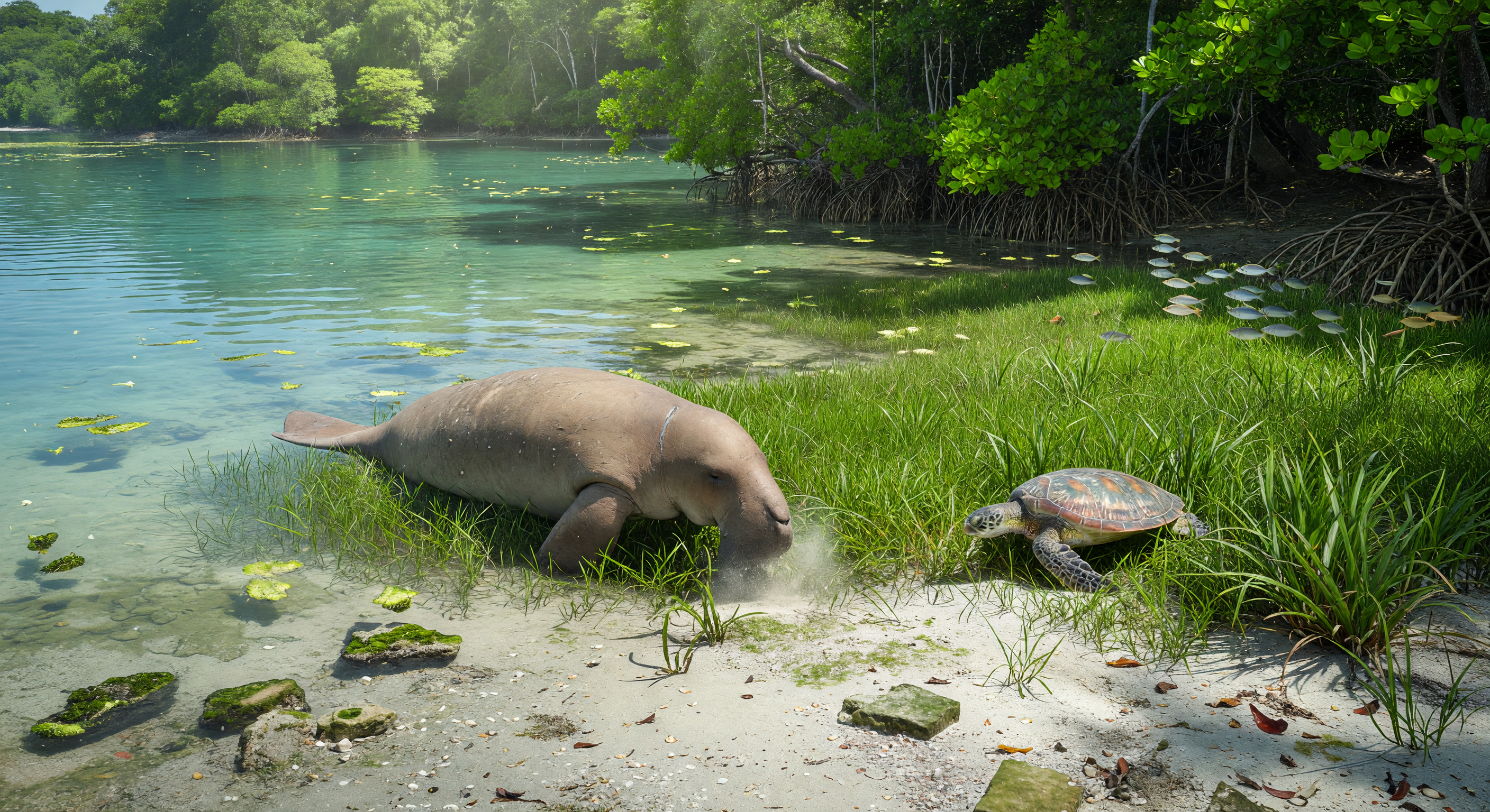 Caption: Several claims are broadly correct in concept—dugongs and green turtles are extant Indo-Pacific species and their habitats can persist in tropical coastal refugia during glacial lowstands. The timing range given (“roughly 126,000 to 12,000 years ago”) covers the late Middle to Late Pleistocene, but the caption implies a continuous persistence “during glacial lowstands” without noting that refugial conditions would vary by basin and sea-level. The largest scientific concern is the habitat composition: the caption emphasizes a dense seagrass meadow and calcareous green algae (Halimeda), yet the depicted vegetation is not clearly seagrass, and Halimeda is not distinguishable (and would typically appear as fleshy segmented green thalli rather than generic algae mats). Also, “shallow tropical lagoon” is plausible, but the background landscape reads more like a vegetated riverine/coastal edge than a lagoonal seagrass meadow.