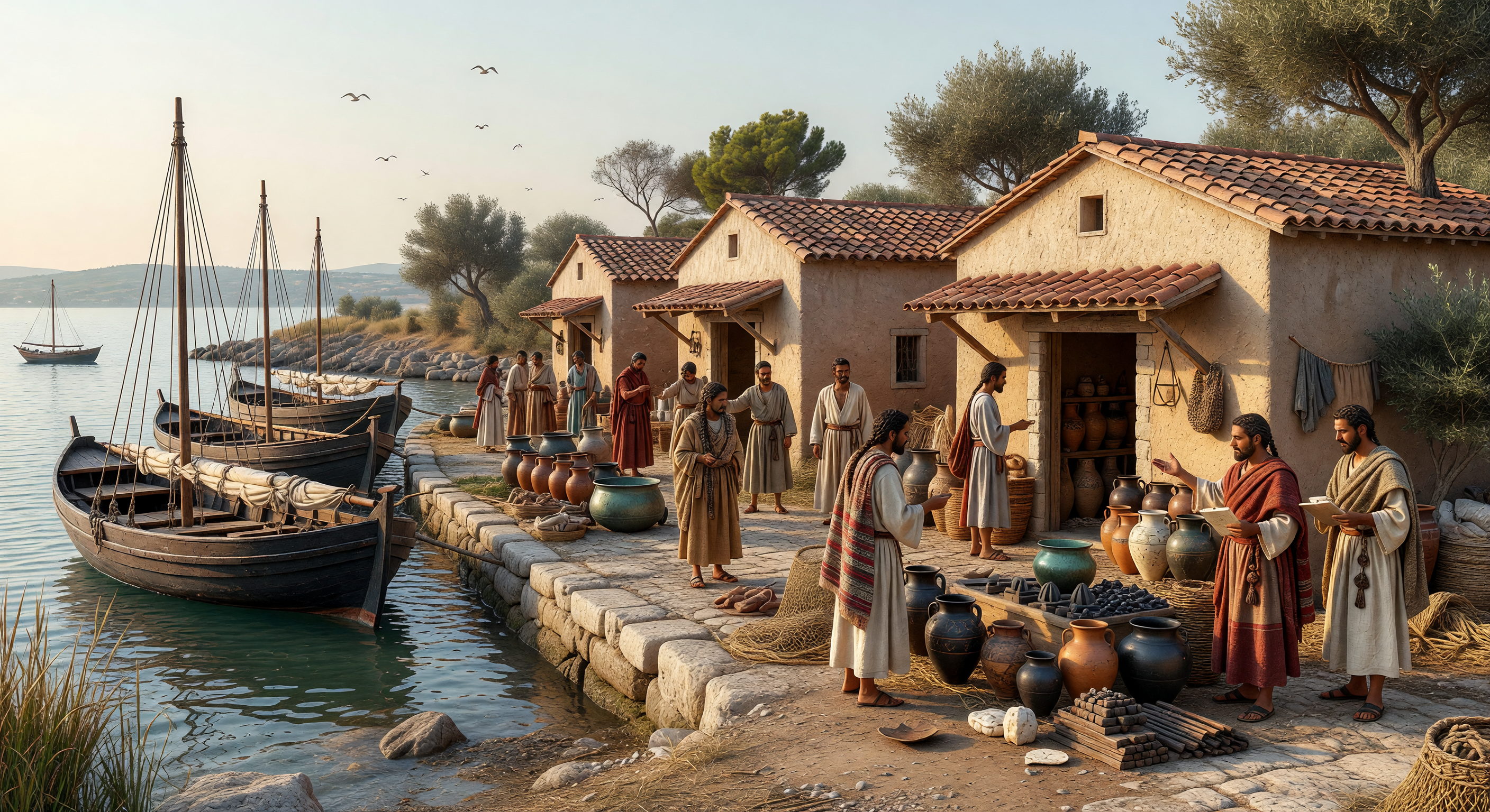 The image depicts a bustling Mediterranean harbor with stone quay, wooden ships with single masts and furled sails, terracotta-tiled roofs on low buildings, olive trees, seabirds, and figures in long woolen tunics bargaining over amphorae, pottery, and goods. While the general coastal landscape, pottery stacks, and trade scene are plausible for an Iron Age Mediterranean port, significant inaccuracies undermine its suitability for 6th-century BC Etruria. The ships resemble generic ancient Mediterranean vessels but lack specificity to Etruscan/Phoenician/Greek types of the period (e.g., more rounded hulls or distinct rigging); more critically, the clothing is a major anachronism—long, flowing robes with stripes and shoulder drapes evoke 1st-century AD Judean or biblical imagery rather than Etruscan tunics, which were shorter tebennae or cloaks fastened with bronze fibulae, often in checked or simpler patterns. No bucchero pottery (distinctly glossy black), metal ingots, or Etruscan inscriptions are visible; architecture is generically 'ancient' rather than distinctly Etruscan (e.g., missing ornate terracotta decorations). Visual coherence is high, but cultural specificity is low, making it too vague and anachronistic for approval—requires full regenerate to capture Etruscan identity.