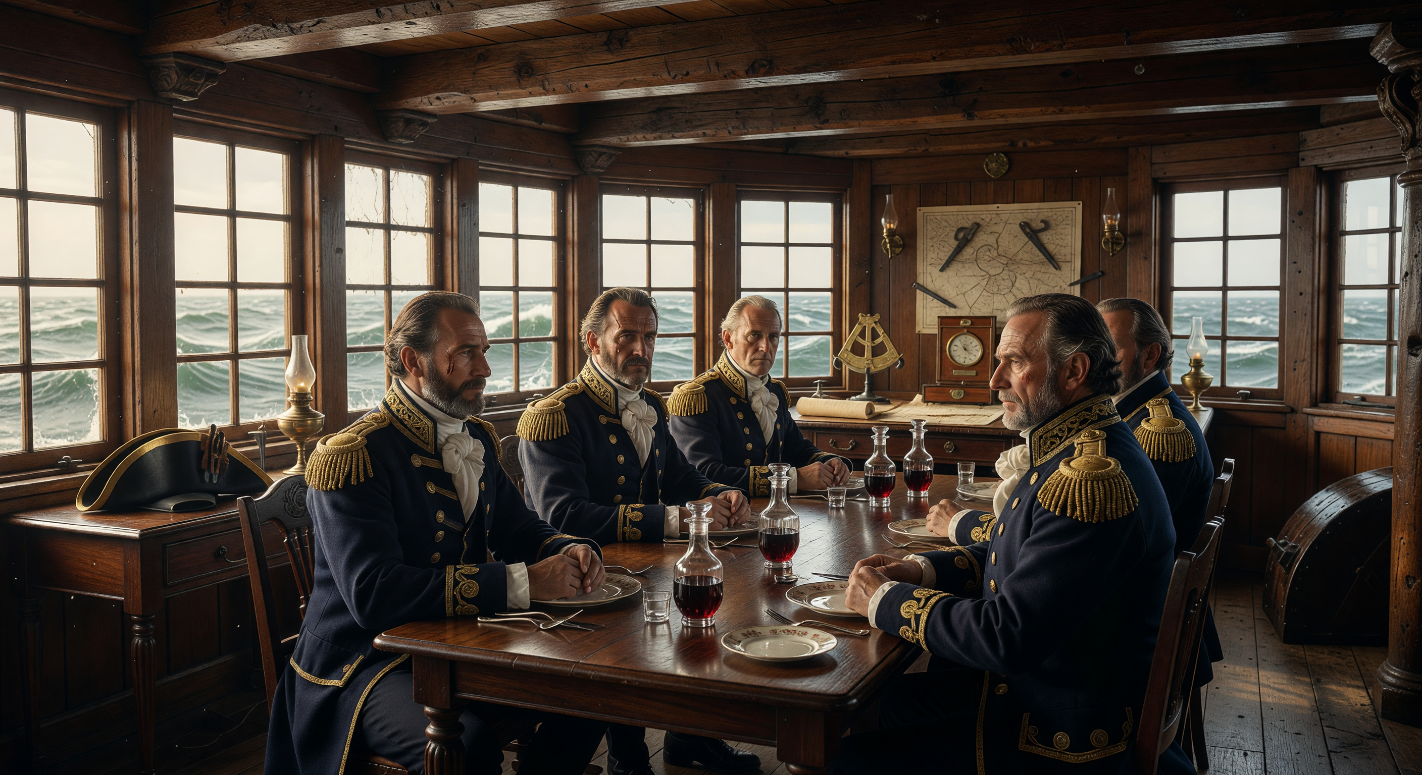Paragraph 1: The committee broadly agrees that the scene convincingly evokes a Royal Navy interior aboard a wooden warship: the stern-cabin-like setting, multi-paned windows, choppy sea outside, dark blue officer uniforms with gold trim/epaulettes, nautical instruments on the wall/table, and the general sense of formal naval dining are all aligned with the intended Napoleonic-era atmosphere. Paragraph 2: IMAGE issues identified by the committee include: the stern/galleries windows are too flat, rectangular, and modern-looking rather than the more authentic curved/arched or otherwise period-appropriate great-cabin glazing; the wall lamp is anachronistic, reading as a later kerosene/argand-style lamp instead of an 1805-appropriate candle lantern or earlier whale-oil lamp; the uniform epaulette fringe appears overly dense, ornate, and slightly mid-Victorian/cinematic rather than matching the stricter 1795–1812 Royal Navy style; the uniform fit/detailing may be slightly too decorative/modernized in a cinematic way; the tableware/glassware presentation feels somewhat cinematic and not clearly period-specific; the navigation objects are present but not fully specific enough in the image to confirm each one as a sextant and marine chronometer with certainty; the clock-like object may not clearly read as a marine chronometer; and the overall styling drifts a bit toward later-19th-century naval aesthetics. Paragraph 3: CAPTION issues identified by the committee include: “opulent” may overstate the likely level of comfort/furnishings in a ship’s great cabin and should be softened; the claim of “mahogany furniture” is plausible but not directly evidenced by the image; “fine bone china” is plausible in principle, but the image does not clearly prove it and the phrasing is more specific than the visual support; the claim that brass sextants and marine chronometers are present is somewhat stronger than the visual evidence supports, since the image shows navigation instruments and a clock-like box but not unequivocal identification of both objects; “North Atlantic” cannot be verified from the image alone and is inferential; and the overall caption slightly overstates the certainty of some material details relative to what is clearly visible. Paragraph 4: Final verdict: adjust for both image and caption. The image is close and historically suggestive, but several elements need period-accuracy refinement, especially the windows, lighting, and uniform styling. The caption is broadly accurate but should be tightened to avoid overstating unverified specifics and to better match what the image can clearly support.