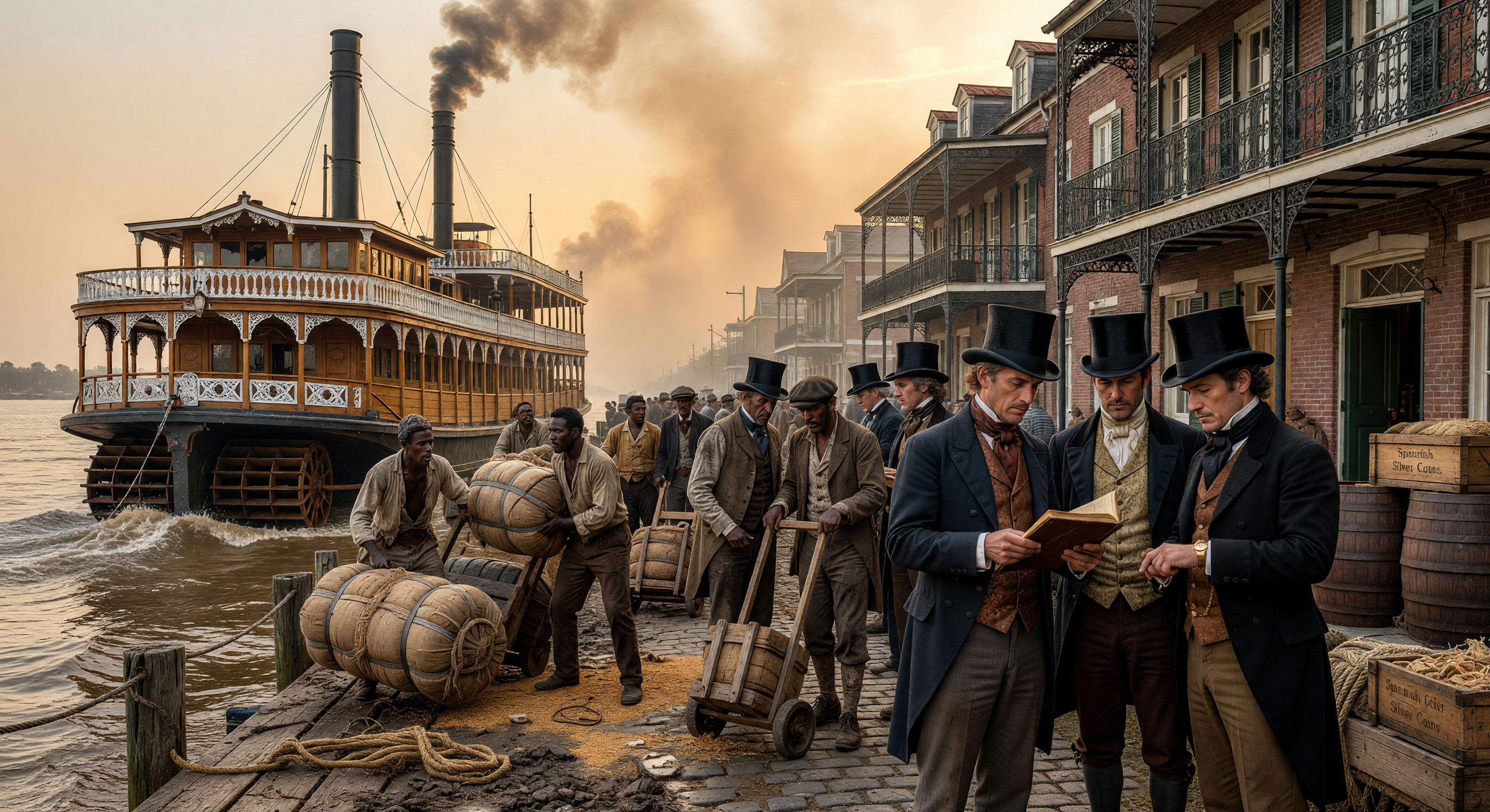 IMAGE issues identified by the committee: 1) The cargo shown is visually inconsistent with cotton bales; multiple reviewers say the prominent loads look like cylindrical barrels, hogsheads, or other rounded wrapped cargo rather than rectangular cotton bales. 2) A foreground crate is labeled “Spanish Silver Coins,” which several reviewers identify as an anachronistic or at least highly suspicious detail for 185 New Orleans commerce. 3) The foreground men’s clothing is sometimes read as too theatrical or slightly late-19th-century/European in tailoring, especially the top hats, frock coats, and over-stylized merchant attire. 4) The streetscape and balcony-heavy brick facades are plausible but read to some reviewers as a stylized or over-general “French Quarter” look rather than a clearly specific historically faithful streetscape. 5) There is a disagreement in the reviews about the steamboat configuration: some note the vessel appears to have a single prominent smokestack, while others see it as twin-stacked; because the image itself is ambiguous, that detail remains visually inconsistent. 6) Some reviewers felt the laborers’ dress is broadly acceptable, but the crowd staging is somewhat theatrical/uniform rather than clearly differentiated by occupation and status.