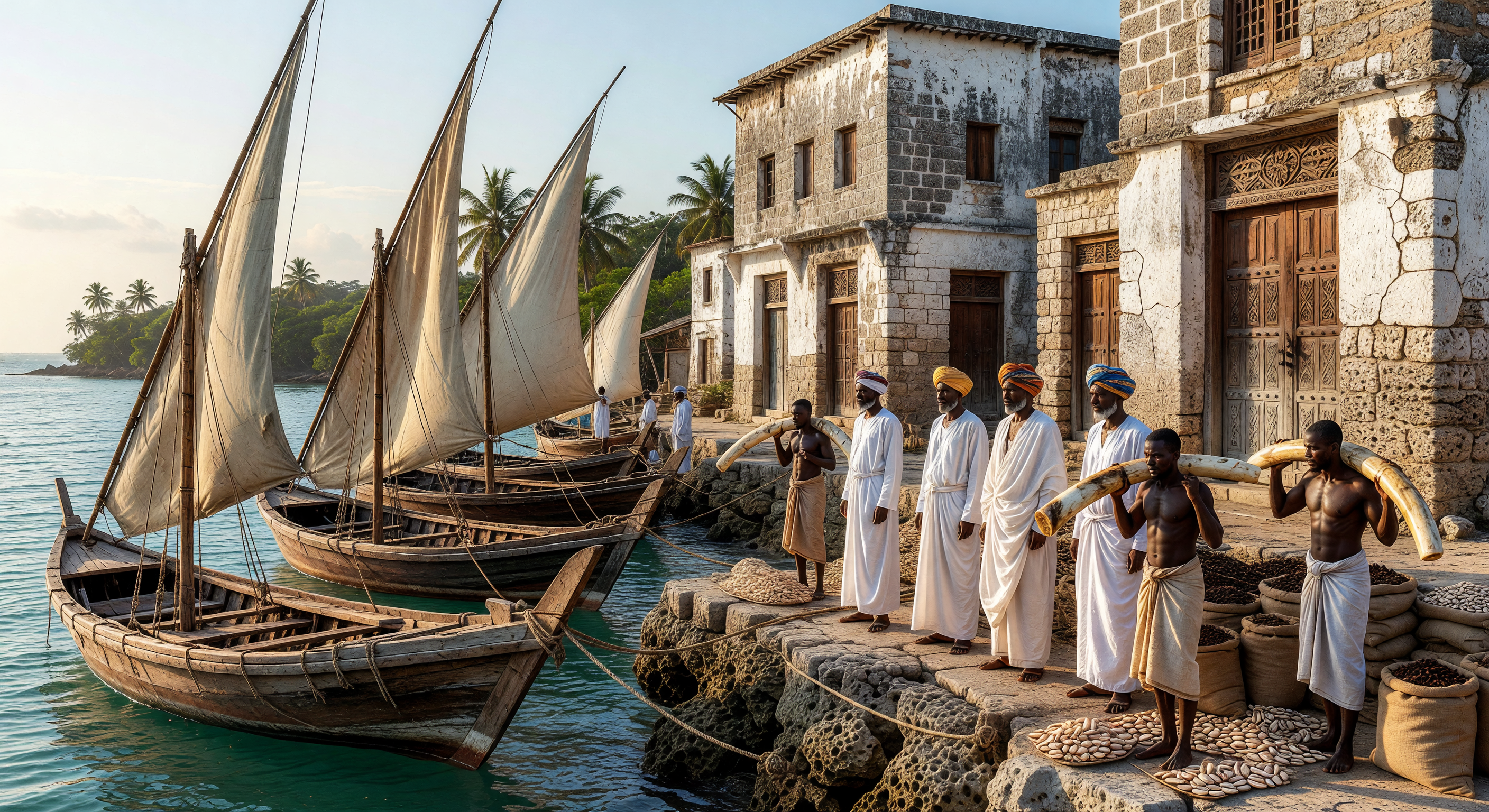 Caption: The caption contains multiple high-risk specificity claims that are not supported by the image and are potentially inaccurate in wording. “Fossilized coral” as a pier material is unlikely to be literally fossilized coral; Zanzibar’s coastal building stone is largely coral limestone/coral rag, but phrasing suggests geologic fossilization rather than quarried/coastal coral rock. The description of “mtepe dhows” with mangrove-timber planks sewn with coconut-fiber coir is a very specific technical assertion that cannot be confirmed from the visuals and may be conflated with dhow construction details that vary by region and period. Finally, the commodities are correct in general (ivory and cloves were major exports), but the caption presents them as definitively “the primary commodities” and ties them to a precise mid-19th-century commercial dominance without offering nuance; the image also does not clearly show cloves or ivory in identifiable form. Because these issues involve both unverifiable technical claims and potentially misleading geological phrasing, the caption needs regeneration rather than minor adjustment.