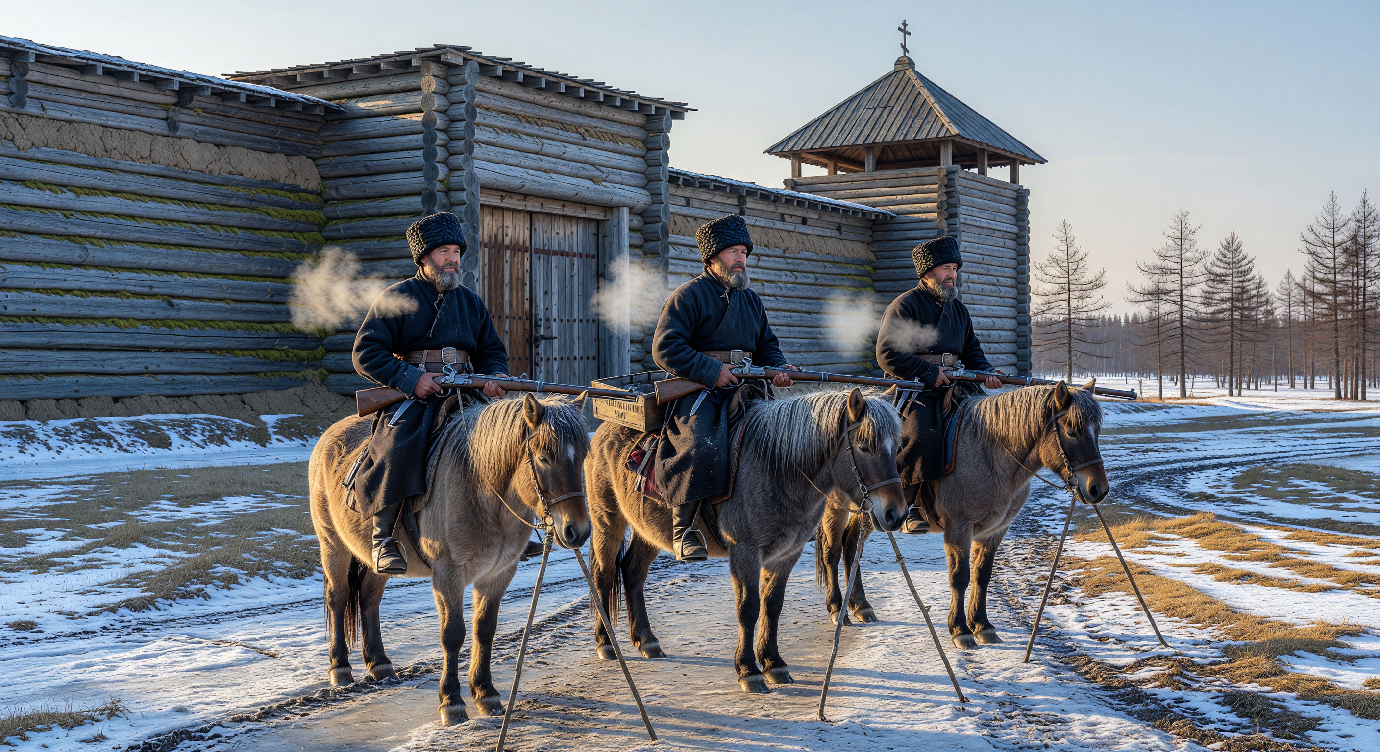 Drie Transbaikaalse Kozakken te paard houden de wacht voor de imposante muren van een Siberische *ostrog*, een houten vesting opgetrokken uit massieve lariksstammen. Gekleed in zware wollen kaftans en bonten *papakha's*, zijn deze grenswachten bewapend met vuursteengeweren op houten tweepoten en rijden zij op de kleine, geharde Jakoet-paarden die essentieel waren om te overleven in de wildernis. Halverwege de 19e eeuw vormden dergelijke patrouilles de militaire voorhoede van het Russische Keizerrijk tijdens de consolidatie van de macht in Noord-Azië en de controle over de lucratieve pelshandel.