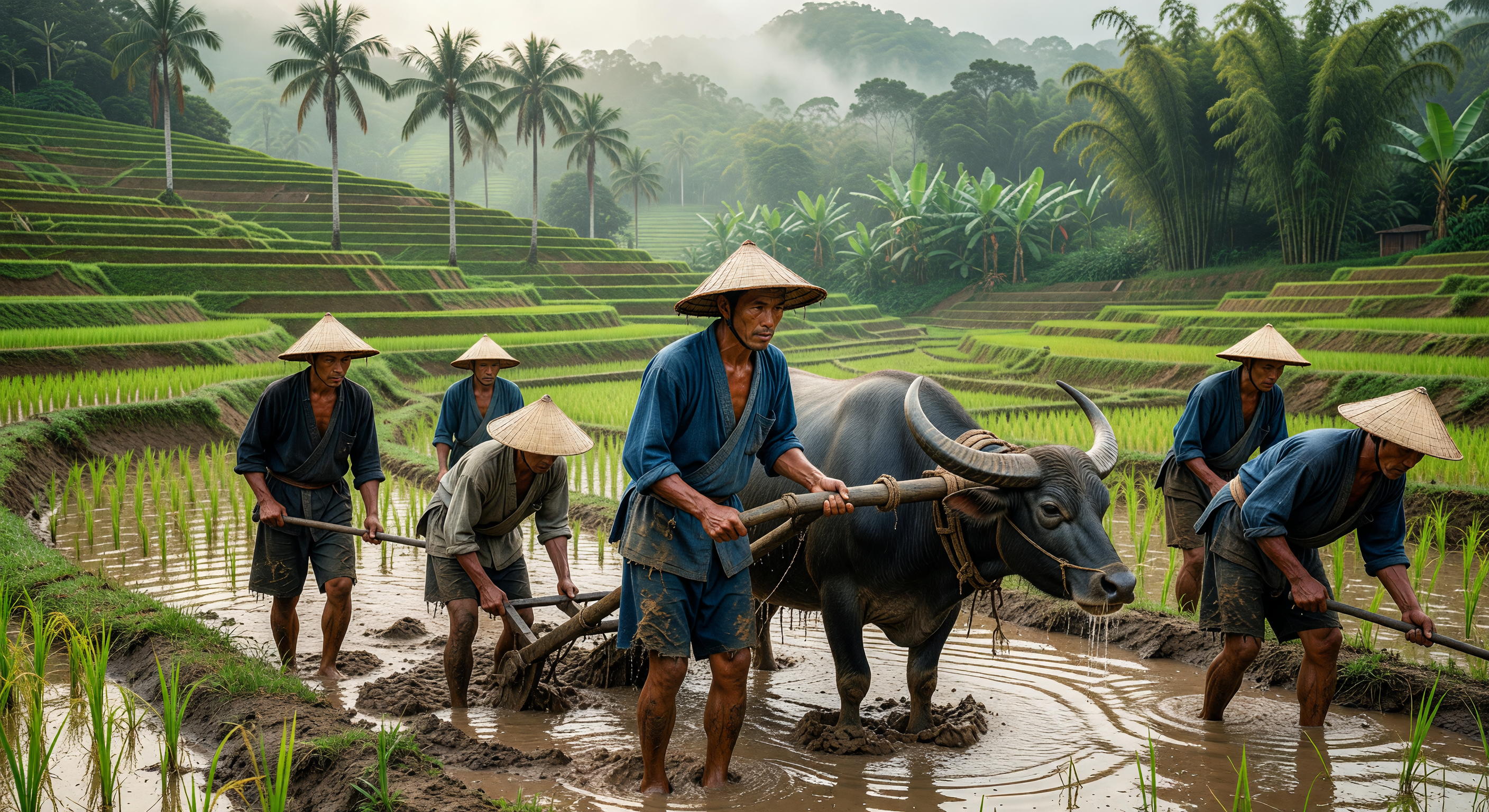 The image depicts flooded terraced rice paddies with water buffalo, farmers in indigo-dyed short jackets (hapori-like), rolled pants, and conical douli hats, which are broadly consistent with wet-rice cultivation in humid subtropical East Asia during the 193s. Water buffalo and manual plowing are accurate technologies for Taiwanese peasant farming under Japanese rule, and the misty mountainous backdrop fits Taiwan's central interior (e.g., around Ali Mountain regions). However, significant anachronisms and cultural mismatches necessitate regeneration: the prominence of coconut palms (tall, straight trunks) and dense bamboo thickets evokes Vietnam or Indonesia far more than Taiwan's ecology, where betel nut palms, camphor trees, and less tropical canopy dominate; Taiwan's flora is humid subtropical with fewer Southeast Asian tropical indicators. Clothing is overly uniform and idealized (all men in matching blue outfits), resembling modern tourist recreations rather than the varied, patched garments of Taiwanese Hoklo farmers; additionally, the central figure's attire subtly suggests a kimono-like silhouette, hinting at Japanese influence but not precisely matching Formosan peasant wear. No Japanese colonial markers (e.g., signage, infrastructure) appear, reducing specificity. Visual coherence is high, but plausibility for 193s Taiwan is low due to these regional mismatches.