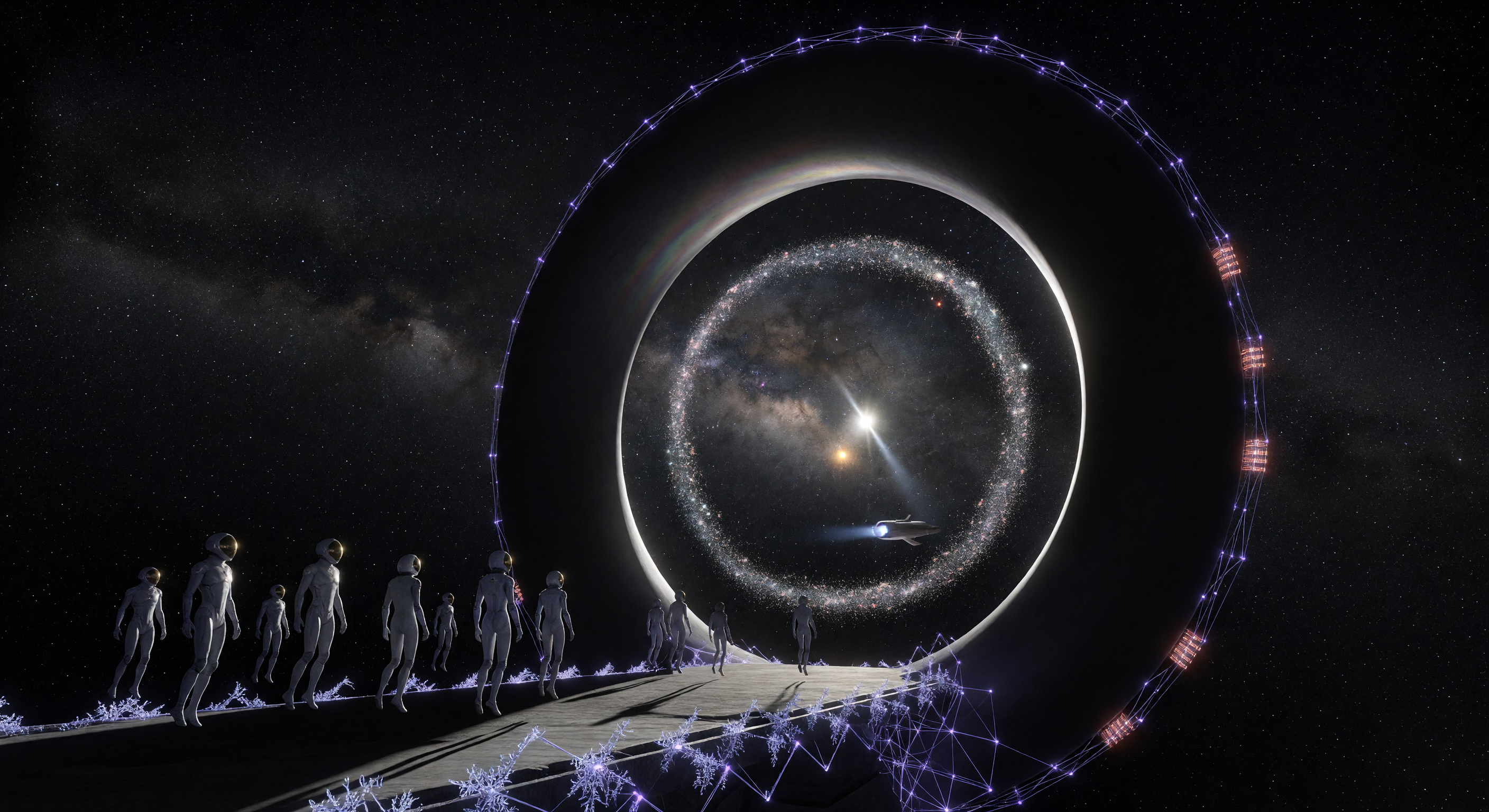 Deze monumentale, twintig kilometer brede ring van obsidiaanzwarte metallische waterstof zweeft in de ijzige leegte van de Kuipergordel en fungeert als een zwaartekrachtlens naar het Alpha Centauri-stelsel. Tijdens de Solaire Expansie (2500–3000 n.Chr.) stelde deze Alcubierre-Vance-poort de mensheid in staat om de grenzen van ons zonnestelsel te doorbreken en te transformeren tot een interstellaire beschaving. Op de voorgrond zijn post-humane 'Void-Walkers' zichtbaar, wiens langgerekte lichamen en gespecialiseerde pakken een evolutionaire aanpassing vormen aan een leven in de diepe, gewichtloze ruimte tussen de sterren.