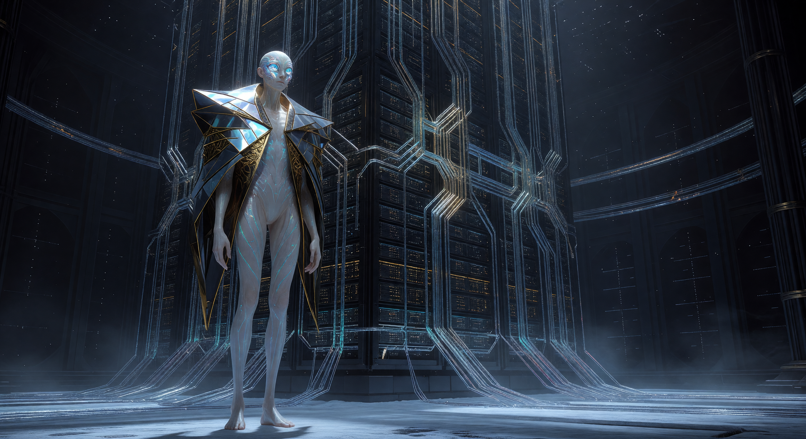 The image excels in visual coherence and plausibility for a Galactic Age Fashion, Arts & Culture context. The tall, elongated post-human figure with translucent alabaster skin, luminous eyes, and long limbs convincingly depicts 'Long-Form' physiology adapted for low-gravity, standing at what appears roughly eight feet based on proportions relative to the towering server hub. The background architecture—a monolithic quantum server hub with dark metallic panels, glowing conduits, circuit tracery, and a misty/frosty sub-Kelvin vault atmosphere—avoids anachronisms and supports cryogenic tech aesthetics without Earth-era elements. The ceremonial attire, an open geometric mantle with iridescent refractive panels and gold accents, fuses ornate religious filigree with high-utility shielding, fitting the era's cultural fusion. No geological, astronomical, or biological implausibilities; ambient starfield hints and radiation-resistant design enhance scientific plausibility for a spacefaring future. Overall, no major historical/cultural mismatches or incoherence warranting regeneration—it's approve-worthy as a strong conceptual match.