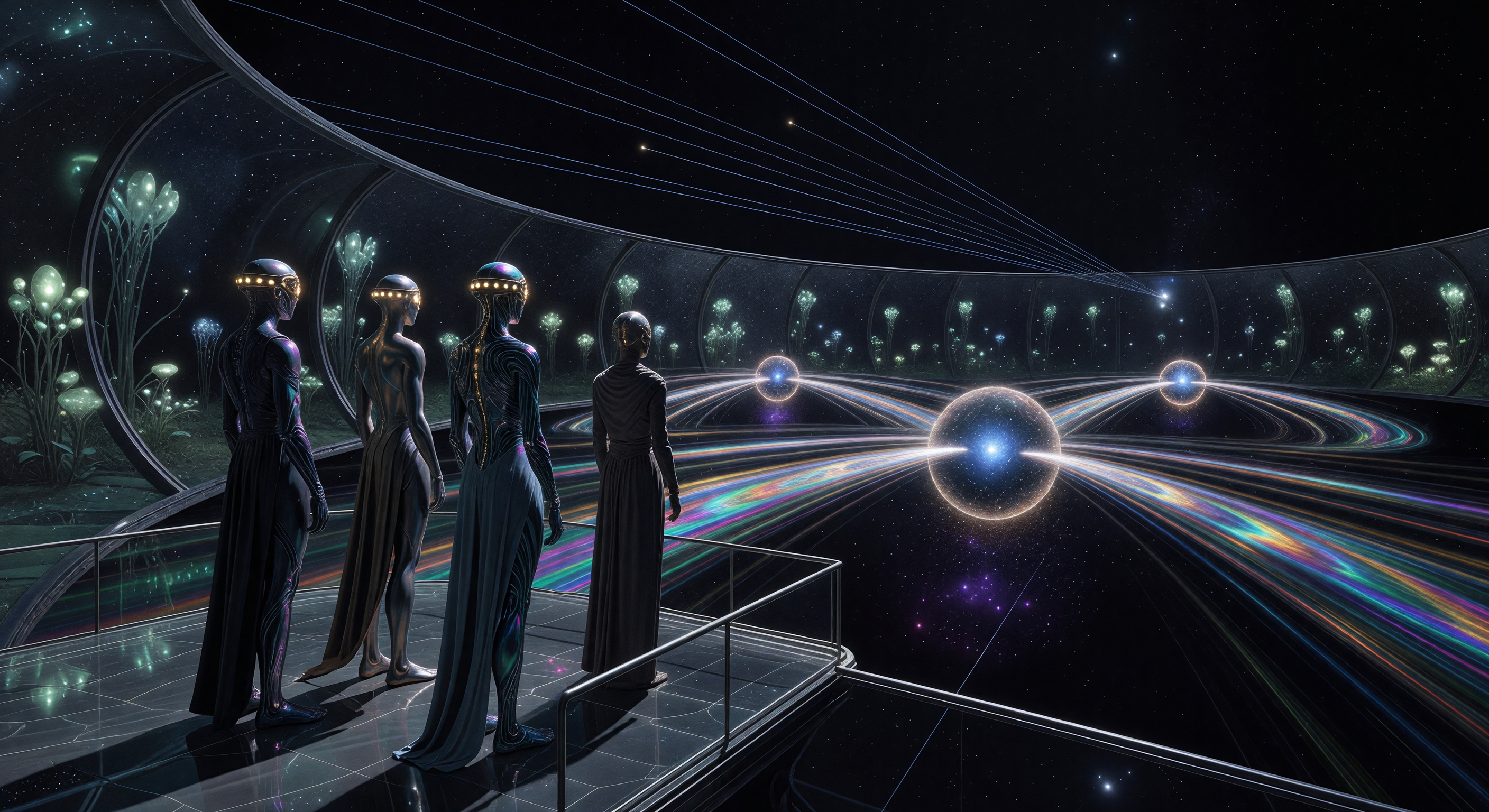 Durante a Era Galáctica (c. 5.000 – 20.000 d.C.), os *Void-Striders* — uma linhagem pós-humana adaptada ao vácuo com derme de liga de chumbo-bismuto e esqueletos de nanotubos de carbono — reúnem-se em habitats na Nuvem de Oort para o Festival de Escultura Gravitacional. A imagem captura o momento em que esferas de matéria degenerada distorcem a luz de estrelas binárias em complexos anéis de Einstein, criando sinfonias visuais que são percebidas pelos sensores "Extensores" dourados desses seres. Este registro arqueológico de uma civilização de nível 1.8 na escala Kardashev exemplifica a transição da humanidade para a Fronteira interestelar, onde a manipulação da gravidade e o uso de motores *Schwarzschild Kugelblitz* elevaram as leis da física ao status de expressão cultural e artística.