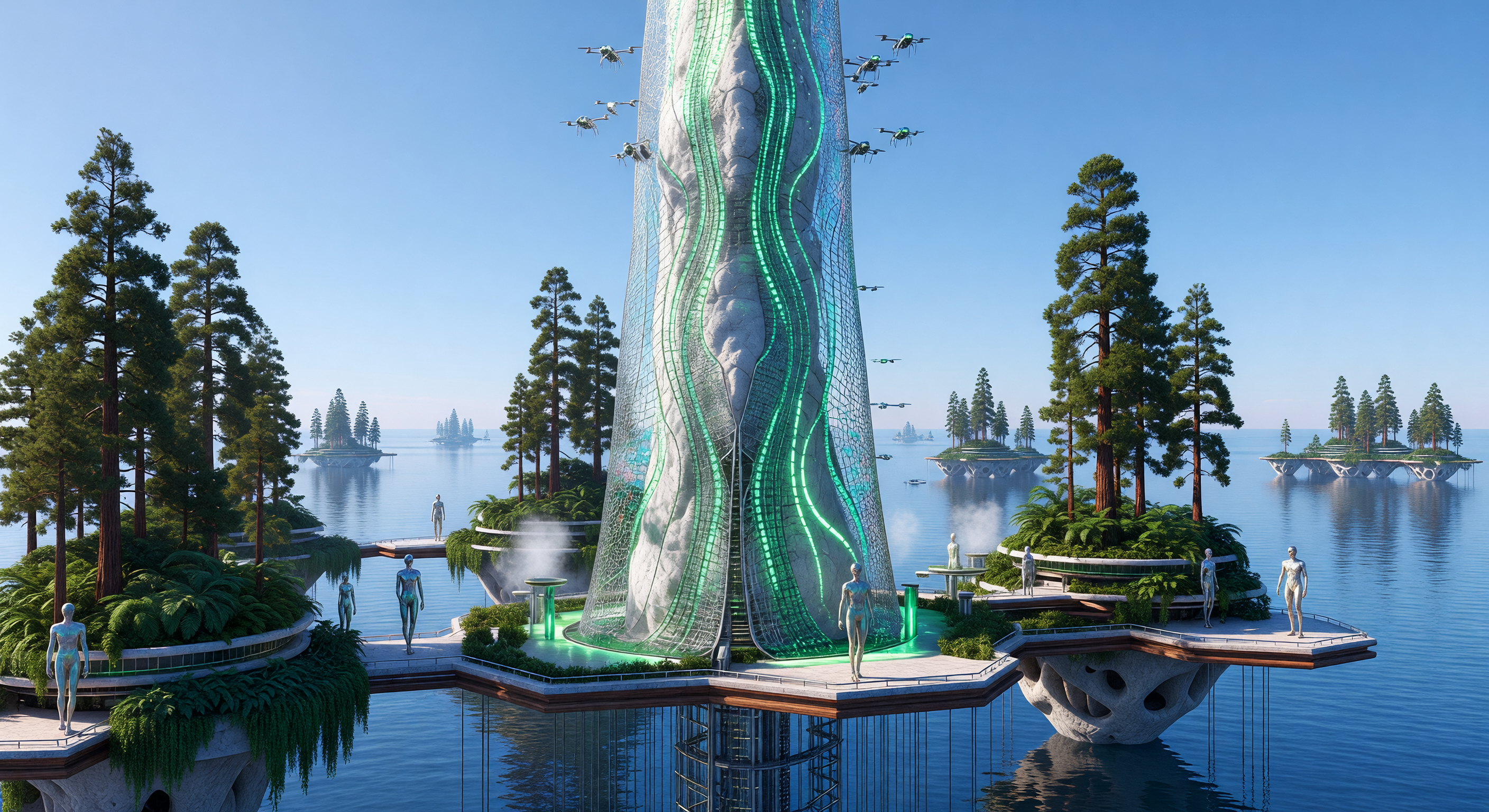 O Pilar de Chronos domina a paisagem de Neo-Tóquio com seu exoesqueleto de grafeno iridescente, cuja luminescência verde-esmeralda sinaliza níveis recordes de sequestro de carbono atmosférico. Esta megastrutura de um quilômetro de altura, datada da era da Grande Divergência (2200–2500 d.C.), exemplifica a adaptação radical da humanidade biointegrada, utilizando plataformas de biocrete ancoradas à plataforma continental para sustentar densas florestas verticais de sequoias geneticamente aceleradas. O registro preserva um momento de simbiose tecnológica extrema, onde drones de alvenaria molecular e humanos com modificações subdérmicas protetoras coexistem em um ecossistema urbano projetado para a resiliência climática profunda.