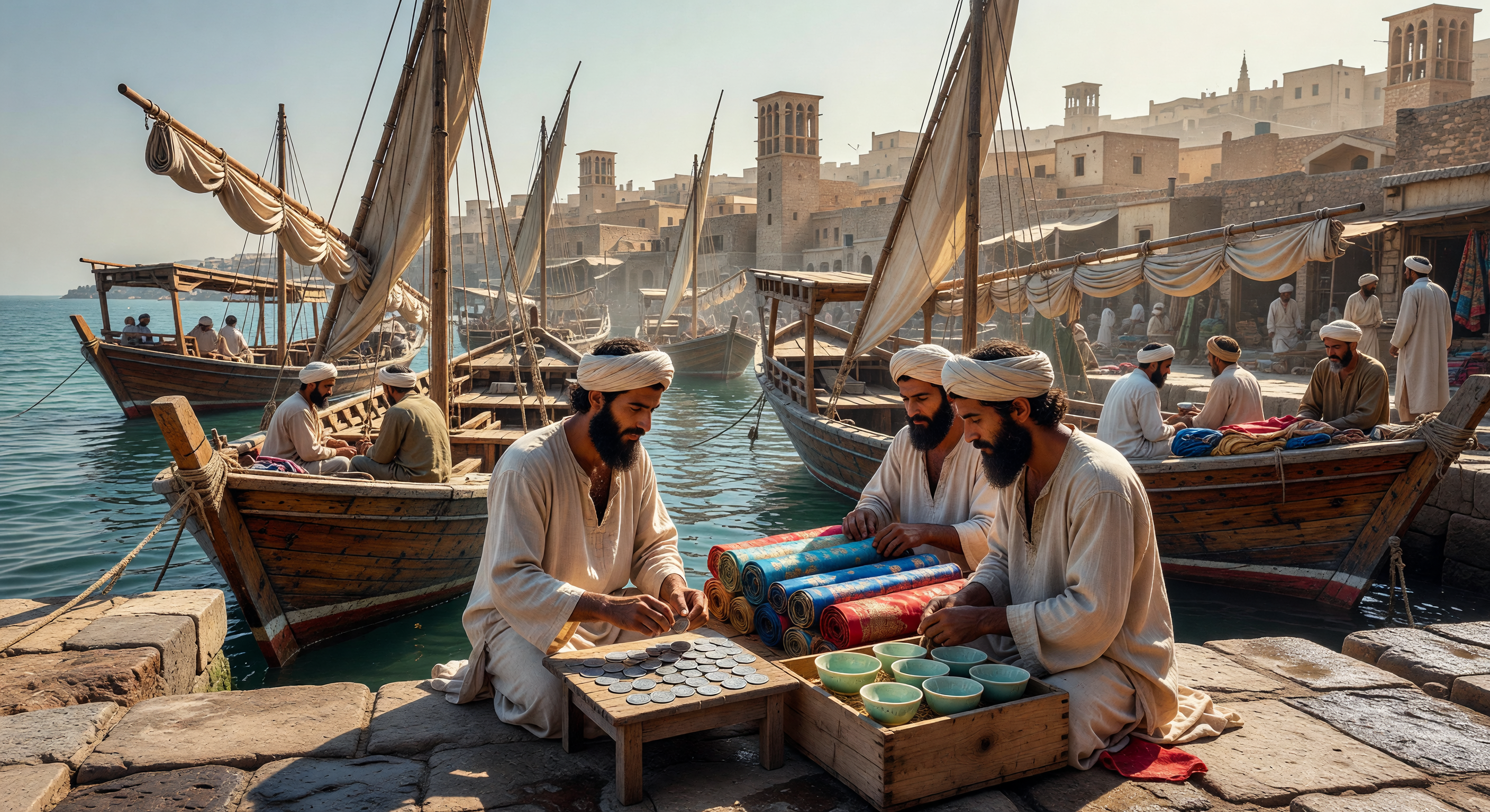 No movimentado porto de Siraf, no século IX, mercadores persas trocam dirhams de prata por sedas vibrantes e porcelanas celadon sobre um cais de calcário banhado pelo sol intenso do Golfo Pérsico. Ao fundo, dhows construídos com a técnica histórica de tábuas costuradas com fibras de coco balançam suavemente, enquanto as icônicas torres de vento da cidade surgem sob a névoa de calor. Esta cena ilustra o papel vital de Siraf como um hub comercial global, conectando o Califado Abássida às riquezas da Dinastia Tang através das rotas marítimas da Idade Média.
