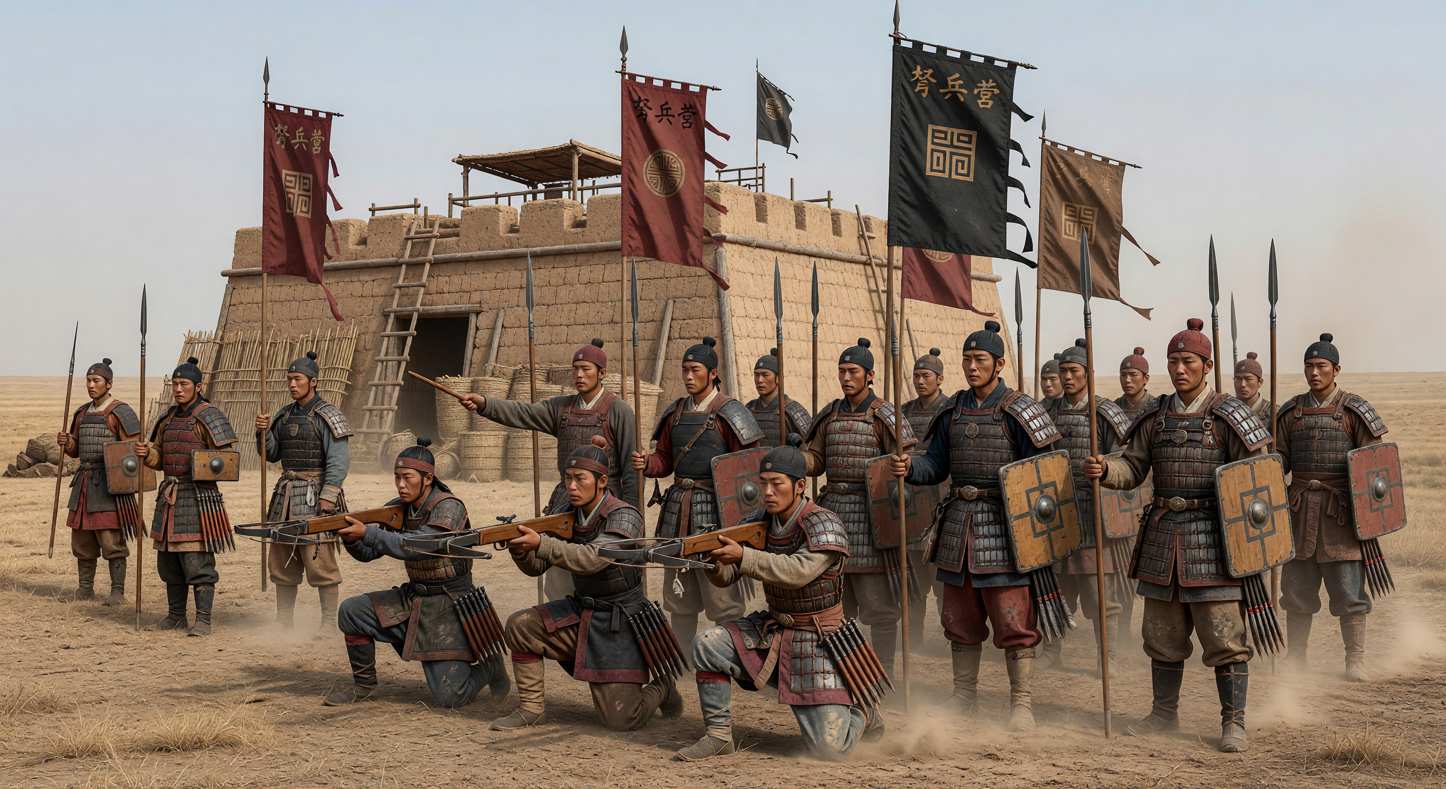 A imagem captura de forma eficaz a essência da infantaria Qin durante o final do período dos Reinos Combatentes: formações compactas de soldados com bestas, lanças, escudos retangulares e, ao fundo, fortificações de terra apiloada numa planície setentrional seca e poeirenta, o que se alinha bem com as evidências arqueológicas de sítios como as covas do Exército de Terracota e com descrições de batalhas na região de Ordos ou nas planícies de Shanxi. As bestas apresentam coronhas de madeira plausíveis e mecanismos de gatilho de bronze, consistentes com os milhares de artefatos recuperados que mostram a tecnologia padronizada do nu (besta) de Qin. Escudos retangulares com padrões geométricos evocam desenhos conhecidos de escudos Qin, e a disciplina geral nas fileiras reflete as reformas militares burocráticas de Qin. A paisagem — campos áridos com poeira e vegetação esparsa — é geológica e climaticamente precisa para o norte da China por volta de 230-221 a.C., sem flora ou fauna anacrônicas. Estandartes exibindo “秦” (Qin) em estilo de escrita sigilar são um forte detalhe de época, e o forte em estilo hangtu com torre de vigia e escadas se ajusta às fortificações móveis de campanha da era.