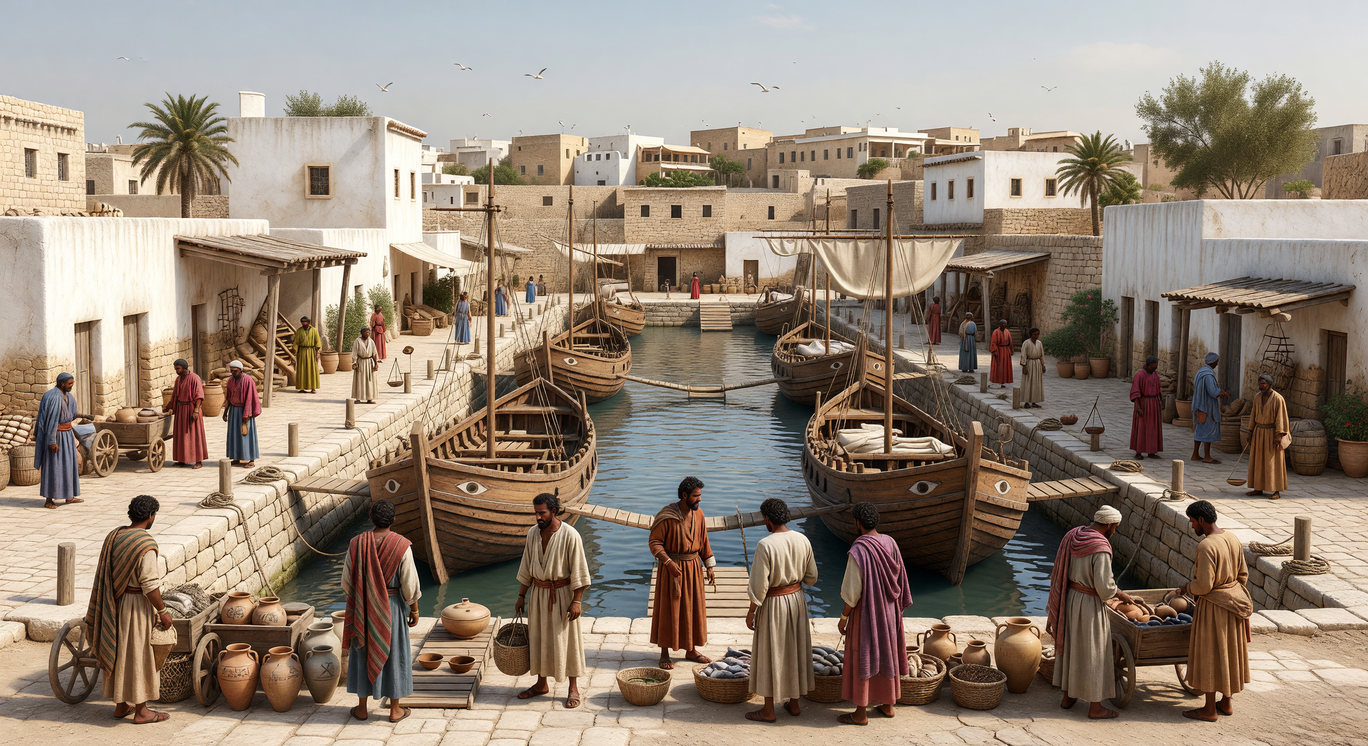 Sob o sol forte do Norte de África, o porto mercante de Cartago fervilha de atividade: comerciantes púnicos e líbios, de túnicas de lã e mantos às riscas, carregam ânforas de azeite, vinho e preparados de peixe para largos navios de madeira atracados em cais de pedra rebocada. Antes da destruição da cidade em 146 a.C., Cartago era um dos grandes centros comerciais do Mediterrâneo ocidental, ligando a África do Norte à Ibéria, à Sicília e ao mundo grego. As marcas pintadas nas ânforas, os lingotes, a cerâmica importada e os armazéns alinhados junto à bacia retangular revelam uma economia marítima sofisticada, sustentada pelo trabalho diário de mercadores, estivadores e artesãos.