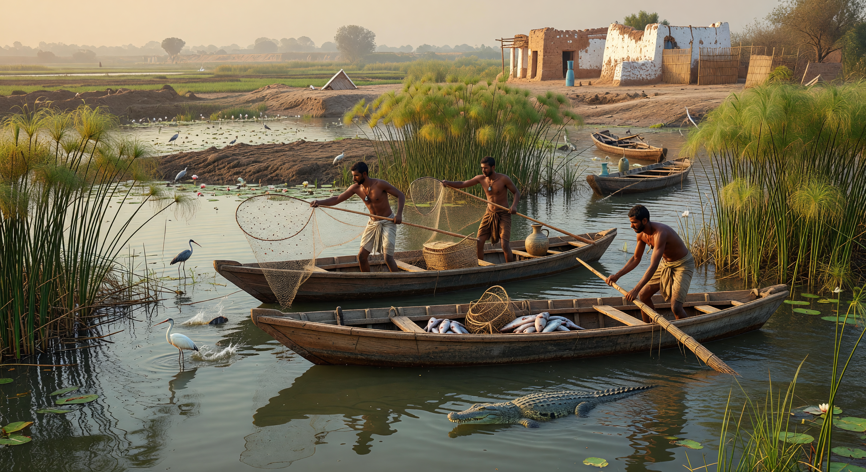 - हिन्दी: नील डेल्टा के दलदल में जाल फेंकते प्राचीन मिस्र के मछुआरे