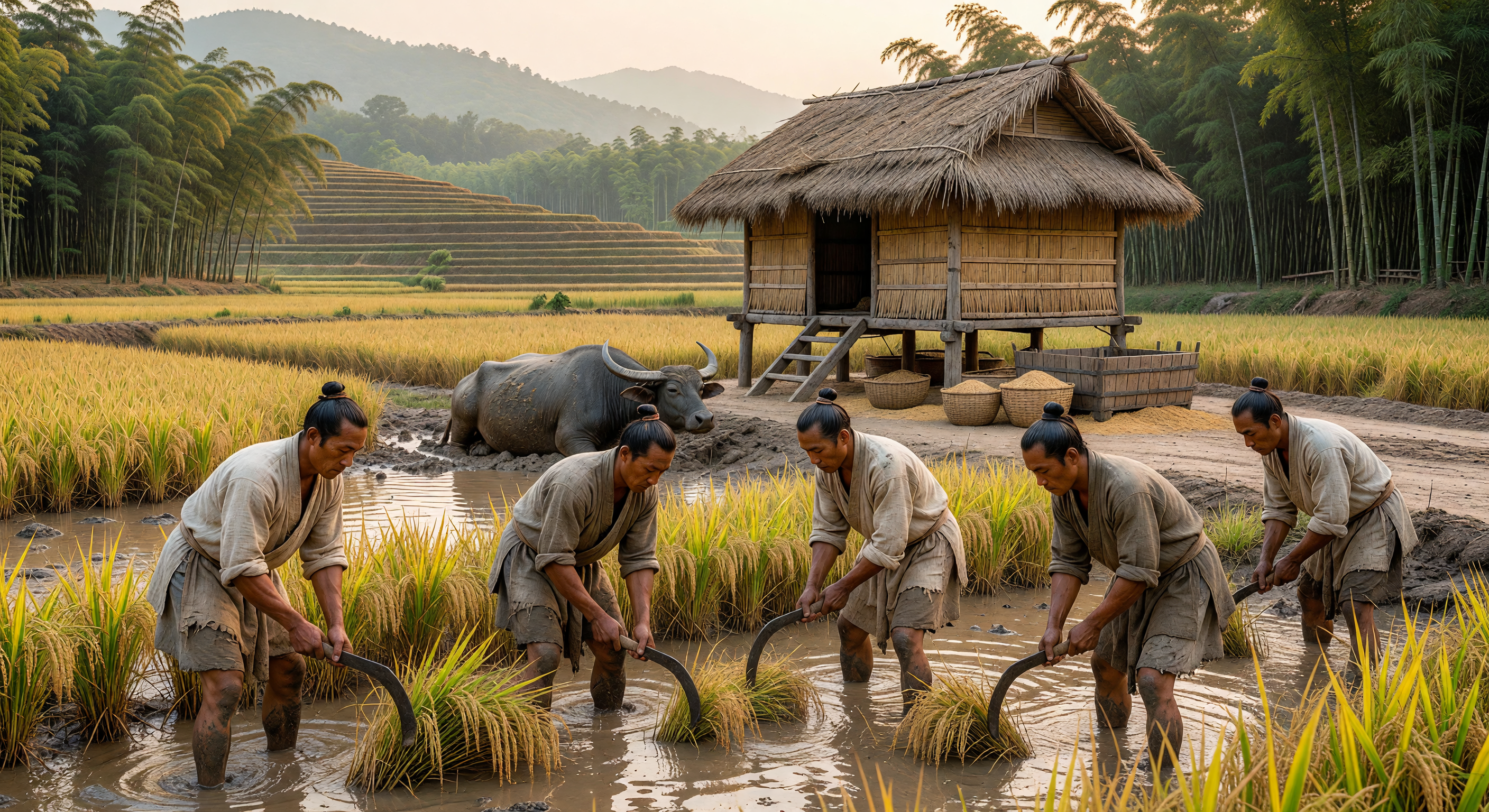 The image depicts a plausible humid subtropical landscape of the Yangtze River Valley with terraced paddies, golden rice, bamboo groves, forested hills, and water buffalo, which align well with the region's geology and biology in Late Antiquity. The elevated thatched granary on stilts visually evokes Ganlan-style architecture used in southern China for grain storage against moisture and pests, and the coarse tunic clothing on male farmers with topknots is culturally appropriate for rural Han laborers during the Three Kingdoms period (220-280 CE). Water buffalo as draft animals are accurate, introduced to China by this era. However, significant issues include the flooded paddies during harvest—rice fields are typically drained before sickle harvesting to allow access and drying, making the muddy, submerged conditions inefficient and ahistorical for 3rd-century practices; this appears as a modern stylized or tropical rice scene rather than precise Han methodology. Tools resemble generic hand-pulling or modern sickles rather than distinctly forged iron sickles common in Han harvests, lacking period-specific short, curved blade details. No overt anachronisms like machinery, but the overall composition feels more like a contemporary Vietnamese or southern Chinese rural idyll than archaeologically grounded 3rd-century depiction, reducing visual coherence for the exact period.