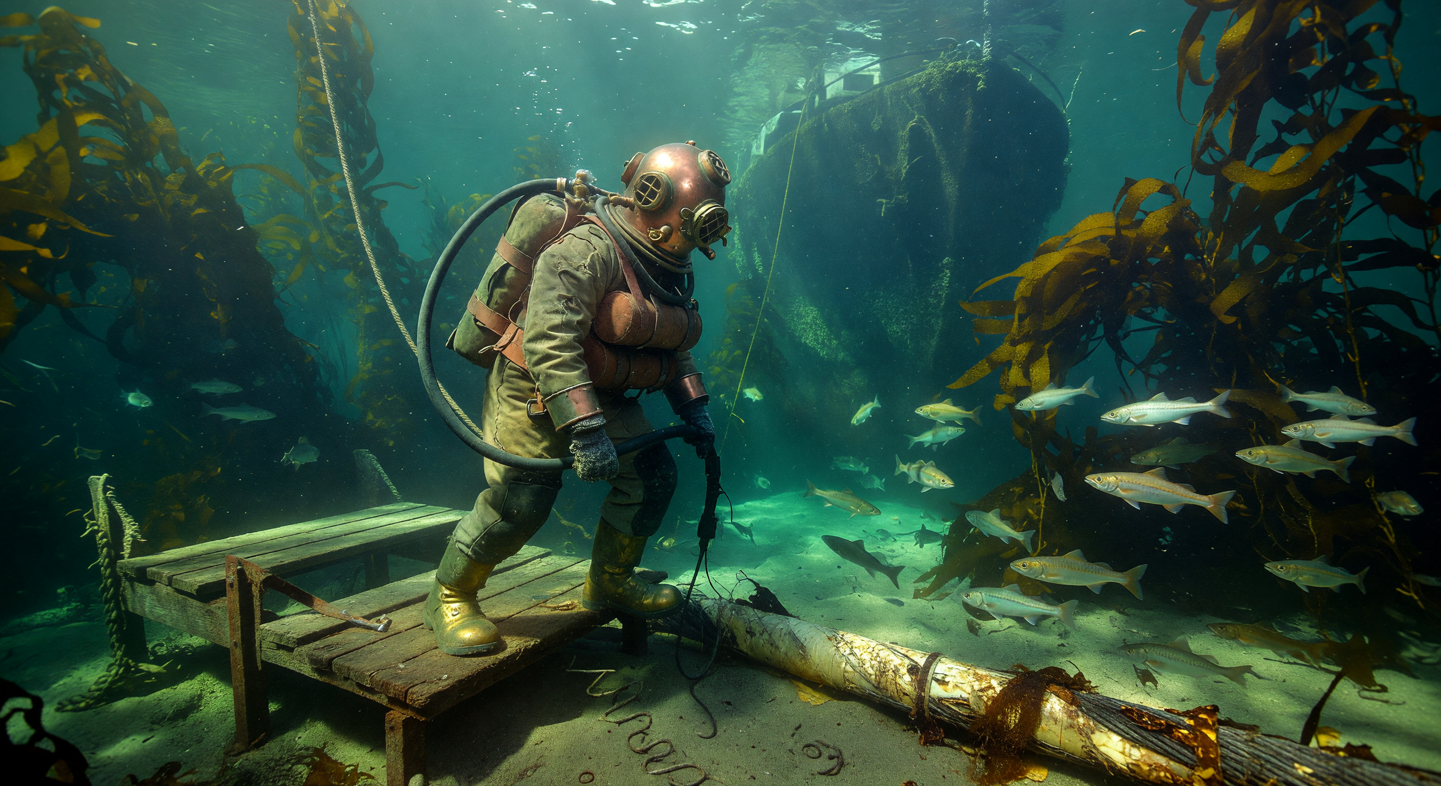 A imagem capta de forma eficaz uma cena subaquática visualmente coerente e plausível do início do século XX, em uma floresta de kelp temperada, com penetração da luz solar, kelp ondulando, peixes gregários genéricos (plausíveis para zonas costeiras como o Atlântico Norte ou o Pacífico) e um cabo blindado semelhante aos cabos telegráficos submarinos históricos, com armadura exposta e fios visíveis. O traje de mergulho com capacete rígido do mergulhador é, em grande parte, correto para 1905: capacete de cobre, traje pesado de lona, botas de latão pesadas e mangueira de ar de borracha alimentada pela superfície são todos elementos apropriados ao período, típicos dos aparelhos de mergulho padrão da Siebe Gorman ou semelhantes, usados durante a Belle Époque em salvamento, obras em pontes e infraestrutura costeira. O cenário corresponde cientificamente a águas costeiras temperadas rasas (10-30 m de profundidade), onde o kelp prospera e onde mergulhadores podiam operar. No entanto, algumas pequenas imprecisões históricas justificam ajustes: o capacete parece excessivamente esférico e não apresenta a característica janela frontal retangular, o peitoral/corselete aparafusado nem as porcas laterais em aleta dos autênticos capacetes Siebe Gorman de 1905, inclinando-se mais para um desenho genérico ou estilizado posterior. Um elemento volumoso semelhante a uma mochila no torso/costas do mergulhador sugere possíveis pesos ou equipamento anacrônicos (o traje padrão usava pesos de chumbo no cinto/na frente, não mochilas), e a plataforma/corrimão de madeira sobre a qual o mergulhador está em pé é implausível para inspeção de cabo em fundo marinho aberto — evoca mais um cais ou destroços de naufrágio do que um local de manutenção. O naufrágio ao fundo acrescenta dramaticidade, mas introduz um elemento não relacionado ao trabalho com cabos. Esses pontos podem ser corrigidos com instruções mais refinadas sobre o equipamento e com um fundo marinho simplificado.