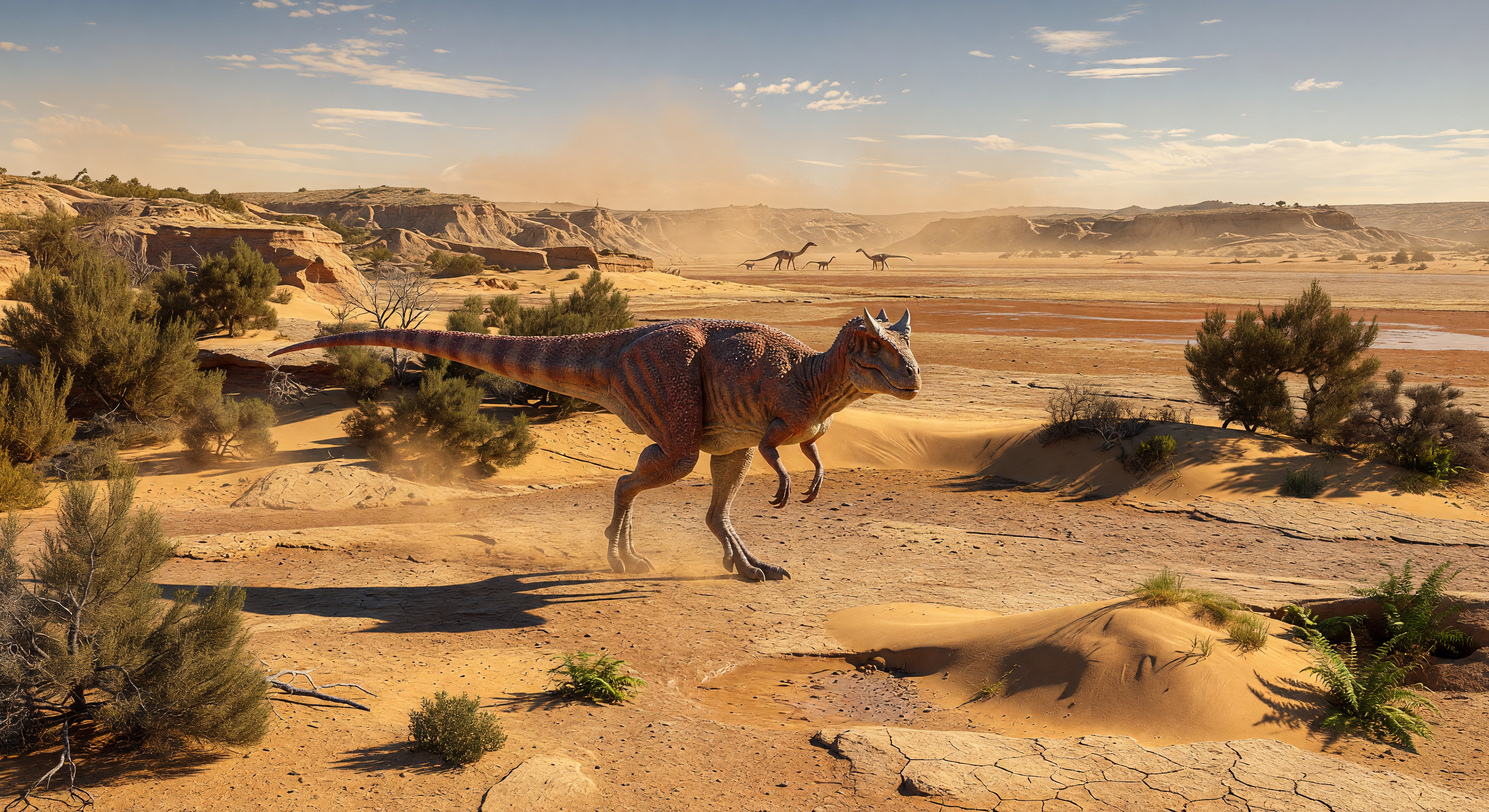 The committee agrees that the scene is broadly accurate for a Late Cretaceous southern-hemisphere dry floodplain: the cracked mudflat, low dunes, dusty arid atmosphere, sparse conifer-like scrub, and overall Gondwanan setting are all plausible. Most reviewers also agreed that the foreground animal is intended to be Carnotaurus-like, with an abelisaurid body plan, and that the background sauropods generally fit a titanosaur-dominated Patagonian ecosystem.