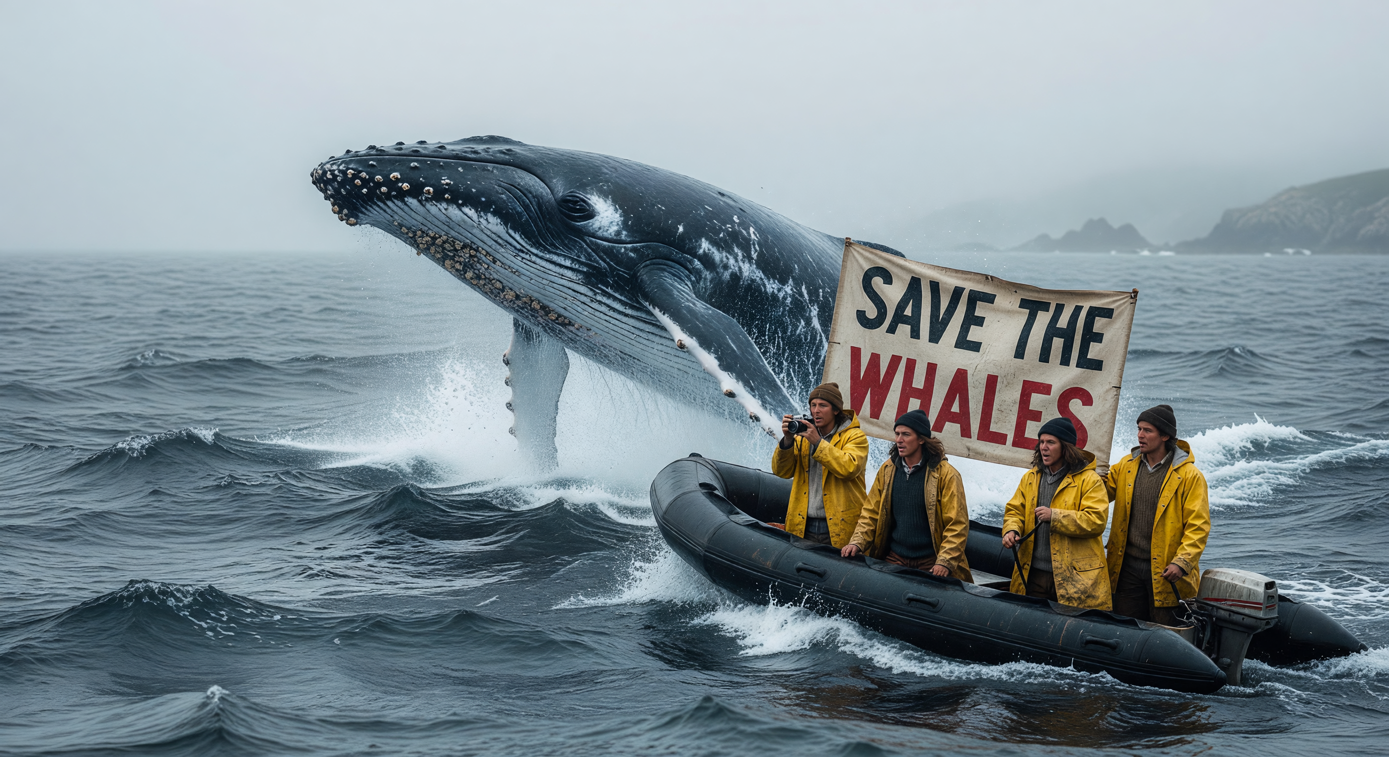 Uma imponente baleia-jubarte rompe a superfície das águas gélidas do Atlântico Norte, ladeada por ativistas que desafiam as ondas em um bote inflável sob um céu carregado de névoa. Trajando capas de PVC amarelo e empunhando uma faixa artesanal com o apelo "Save the Whales", o grupo personifica o fervor e a estética do movimento ambientalista da década de 1970. Este momento icônico reflete a mudança de paradigma na relação da humanidade com os oceanos, documentando a corajosa transição da era da caça industrial para uma nova consciência de preservação global.