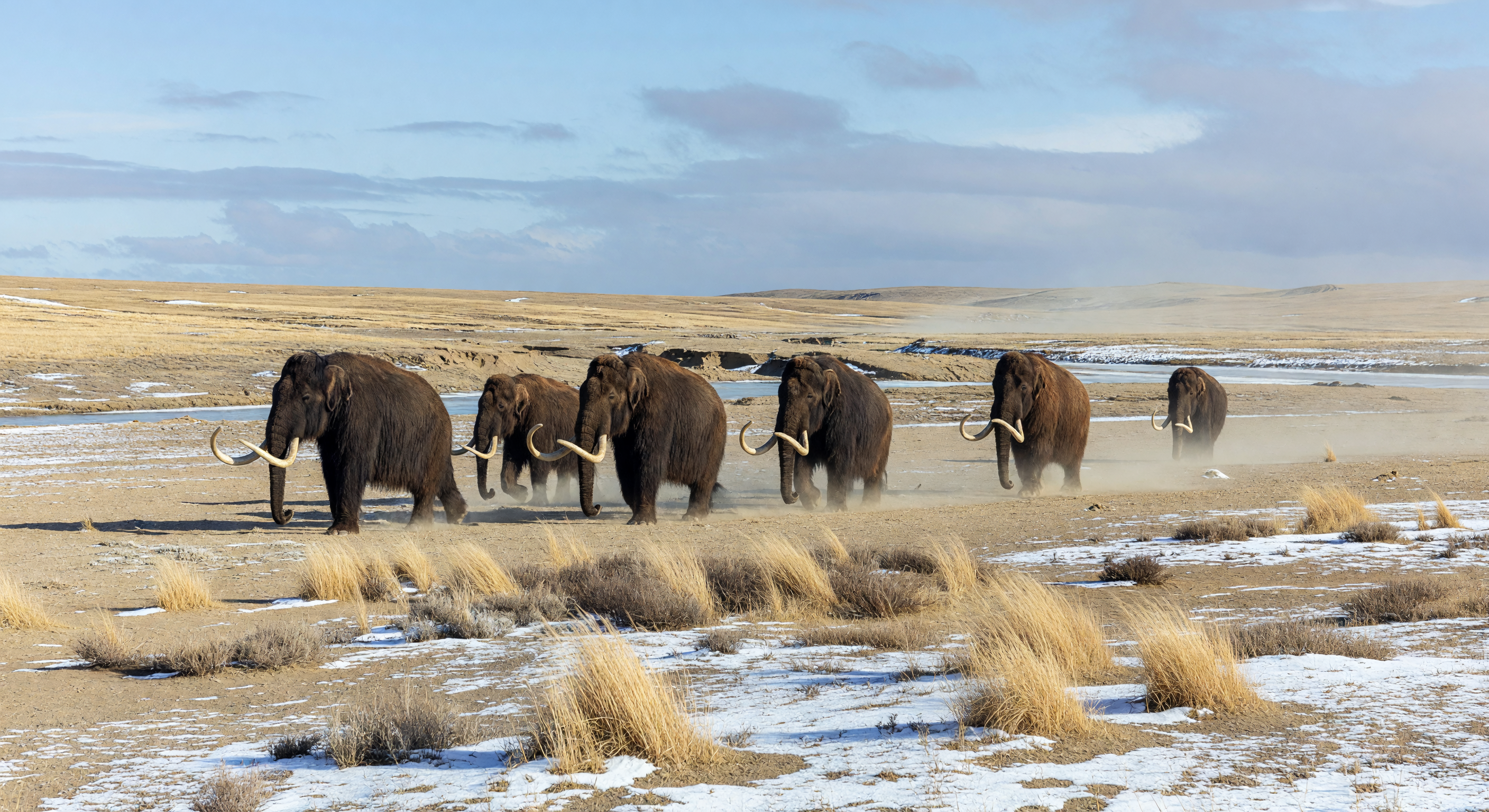 Sob a luz fria do fim do Pleistoceno, um pequeno grupo de mamutes-lanosos, Mammuthus primigenius, atravessa uma vasta planície de loesse varrida pelo vento, entre tufos de Stipa amarelo-palha, Artemisia prateada e finas faixas de neve. Esta paisagem pertence à “estepe dos mamutes”, um bioma seco, frio e muito produtivo que se estendeu pela Eurásia durante as glaciações, sobretudo entre cerca de 100 000 e 12 000 anos atrás. Os seus longos pelos escuros, orelhas reduzidas e presas espiraladas de até 3 metros eram adaptações a um mundo periglacial de poeira, geada sazonal e invernos rigorosos.