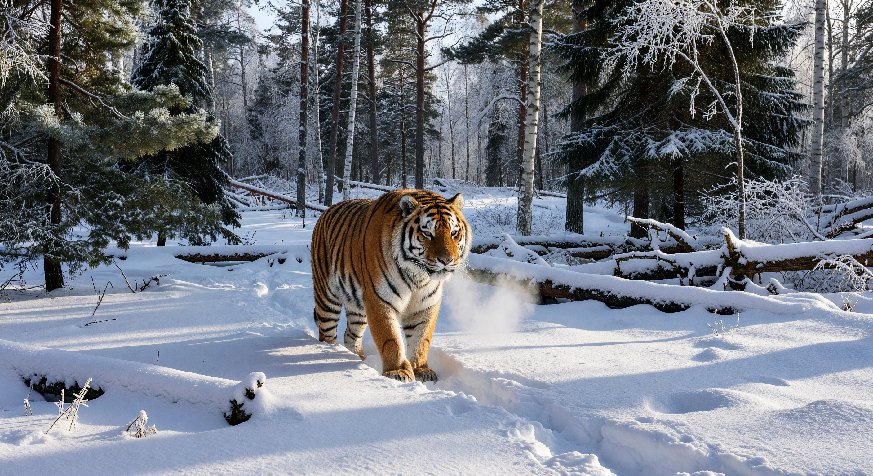 The image accurately depicts an Amur tiger (Panthera tigris altaica) in a snowy taiga landscape consistent with the Ussuri region of the Russian Far East during the 193s interwar period. The tiger's morphology is spot-on: large size, pale orange coat with bold black stripes, and exceptionally thick winter fur for insulation against sub-zero temperatures, all hallmarks of this subspecies. The background features a plausible mix of snow-laden Korean pines (Pinus koraiensis, identifiable by their broad crowns and needles) and silver birches (Betula spp., with characteristic white bark visible on trunks), set in deep, powdery snow with fallen logs and subtle tracks, evoking the remote Siberian wilderness. No anachronisms are present—no human structures, modern tech, or out-of-place flora/fauna—and the scene's visual coherence is high, with realistic lighting from a low winter sun and atmospheric snow mist. Scientifically and culturally, this captures the primeval taiga ecosystem of northern Asia without issues, making it appropriate for the period and zone.
