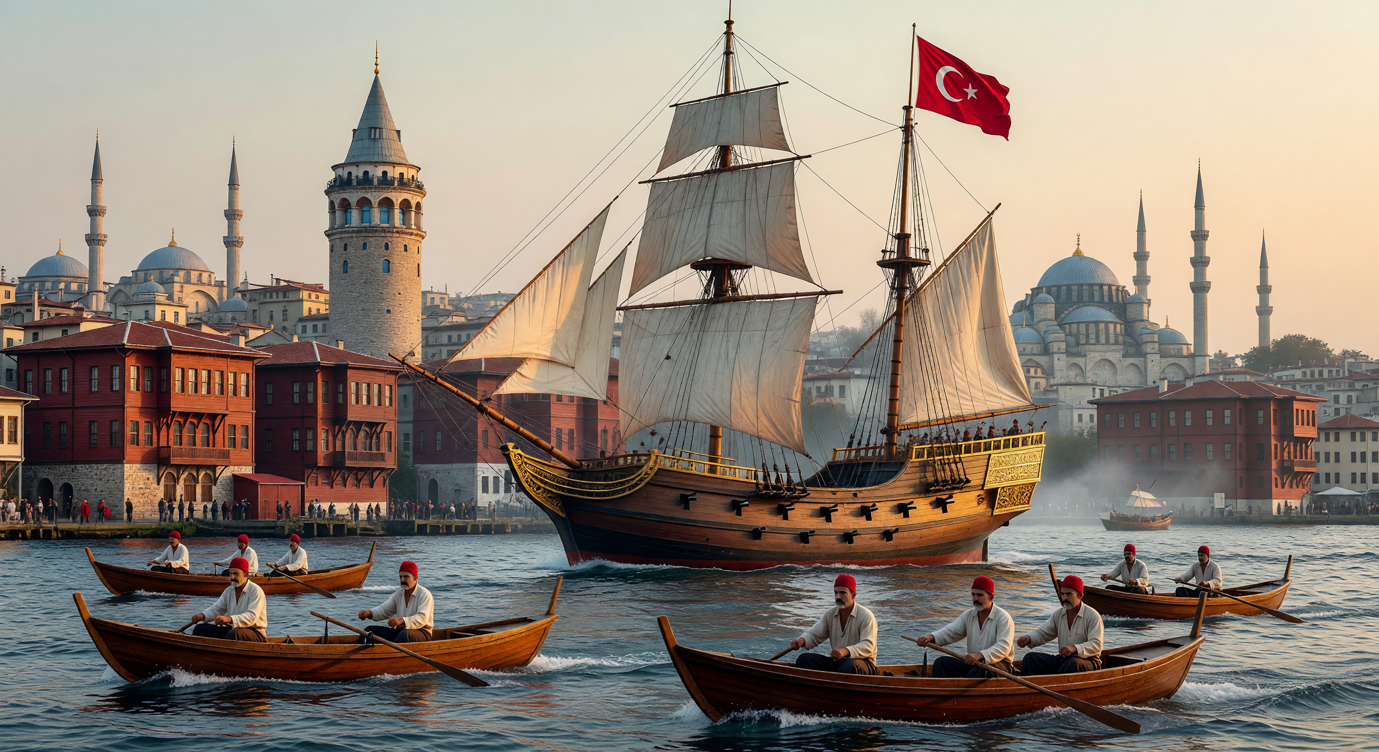 Um imponente *Kalyon* otomano do século XVIII, com suas escotilhas de latão polido e velas de linho branco, domina as águas do Corno de Ouro durante o pôr do sol da "Era das Tulipas". Ao redor da nau de guerra, ágeis caíques de nogueira deslizam entre as ondas, conduzidos por remadores em trajes tradicionais que contrastam com a magnitude da arquitetura naval imperial. Ao fundo, a silhueta de Istambul revela a Torre de Gálata e os minaretes da Mesquita de Süleymaniye, ilustrando o esplendor marítimo e a sofisticação urbana de uma capital que, no auge de seu prestígio, servia como o coração pulsante do comércio entre continentes.