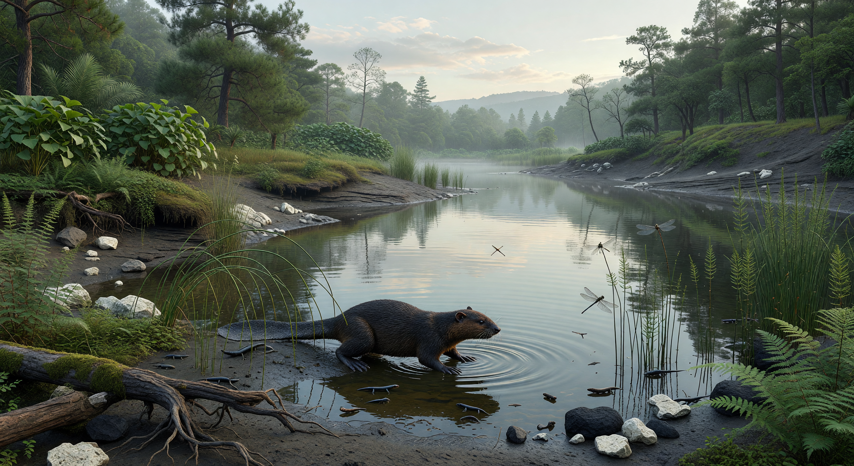Nas margens enevoadas dos lagos de Daohugou, no nordeste da Ásia, um pequeno mamaliaforme semi-aquático, Castorocauda lutrasimilis, desliza da lama para a água imóvel, agitando a superfície com a sua cauda larga e achatada e os pés traseiros em forma de remo. Esta cena desenrola-se no Jurássico Médio–Tardio, há cerca de 165–160 milhões de anos, num pântano florestado de Laurasia dominado por ginkgófitas, coníferas, cavalinhas e fetos, muito antes do aparecimento das plantas com flor. Salamandras jurássicas, libélulas e pequenos peixes completam este ecossistema húmido, revelando que alguns parentes primitivos dos mamíferos já exploravam nichos aquáticos com surpreendente especialização.