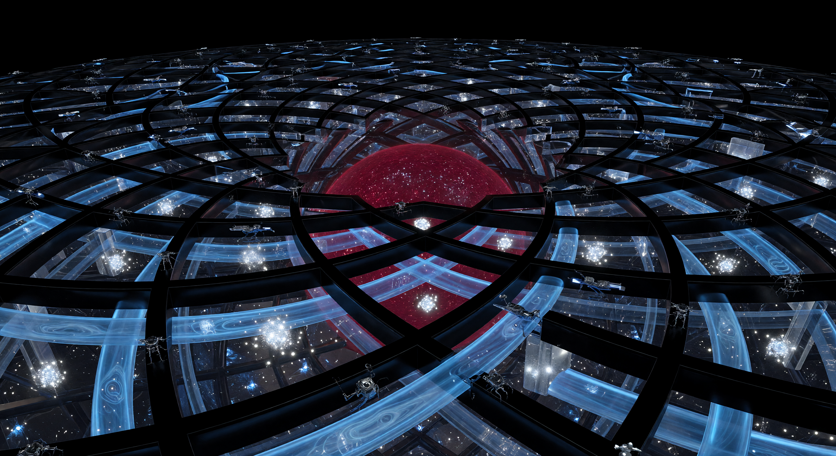 Image issues identified by the committee: 1) The central object is clearly red, not G-type yellow/white, so it visually conflicts with the caption’s stated G-type star. 2) The blue conduits look like opaque, fluid-filled glass tubes or plasma channels rather than cryogenic/vacuum infrastructure; they do not clearly read as superfluid helium-3 systems. 3) The conduit surfaces are too bright and emissive for the implied cold, quantum-coherent cooling architecture. 4) The image’s central red sphere can be interpreted as a red giant, M-dwarf, planet, or generic heat source rather than a controlled stellar energy source. 5) Some reviewers noted the interior star-field panels are visually interesting but scientifically ambiguous. 6) The tiny maintenance robots/drones are plausible, but they are not specifically a mismatch; they were simply noted as a detail, not an error.