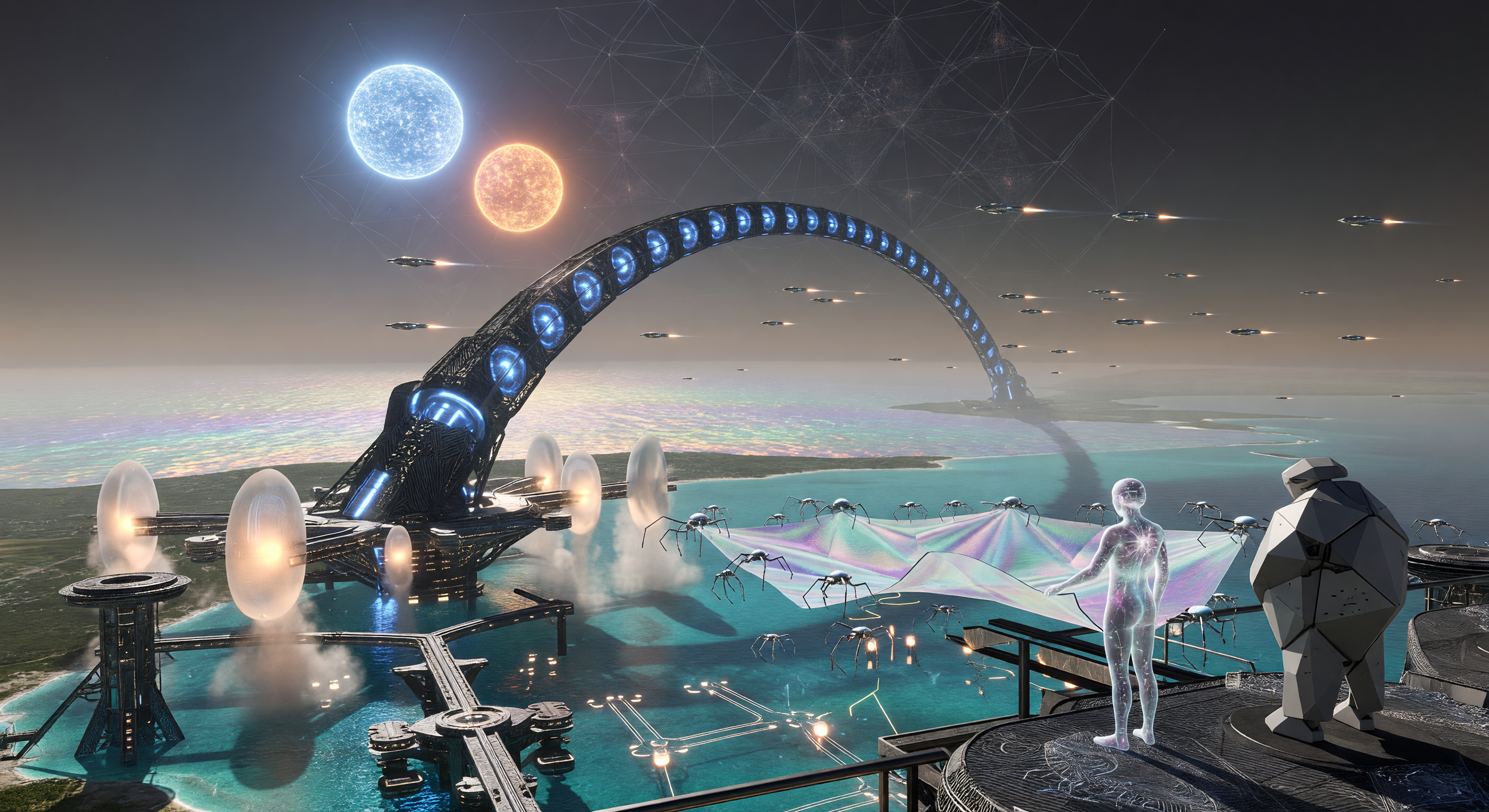 A imagem transmite com sucesso muitos dos elementos-chave da visão descrita na legenda: um sistema binário de estrelas (uma azul-esbranquiçada e outra laranja-avermelhada) é claramente visível, conferindo forte credibilidade astronômica. A grande estrutura em arco se apresenta de modo plausível como um impulsionador de massa eletromagnético ou como uma via/rail de lançamento, salpicada com o que parecem ser bobinas de acelerador. O material iridescente em forma de vela, manipulado por drones automatizados com aparência de aranhas no primeiro plano, é uma representação visual razoável da vela a laser de grafeno, e as duas entidades em primeiro plano—uma entidade humanoide luminosa/translúcida e uma figura angular/geométrica—representam de forma eficaz os « Seres Polimórficos » descritos. O ambiente costeiro/marítimo com águas azul-esverdeadas (teal) e uma plataforma de megasestrutura se estendendo por toda parte é compatível com um « hub marítimo-orbital ». A sobreposição de uma rede geométrica no céu adiciona um bom elemento de infraestrutura de dados. No entanto, a natureza « Shell World » do ambiente é ambígua: o horizonte parece mais uma superfície planetária aberta do que uma casca artificial fechada. A escala da vela em relação à alegação da legenda (« com largura de um quilômetro ») também é visualmente impossível de verificar, e as « nanites de manutenção ativa cintilando na atmosfera » não são representadas de forma distinta além de uma névoa atmosférica geral.