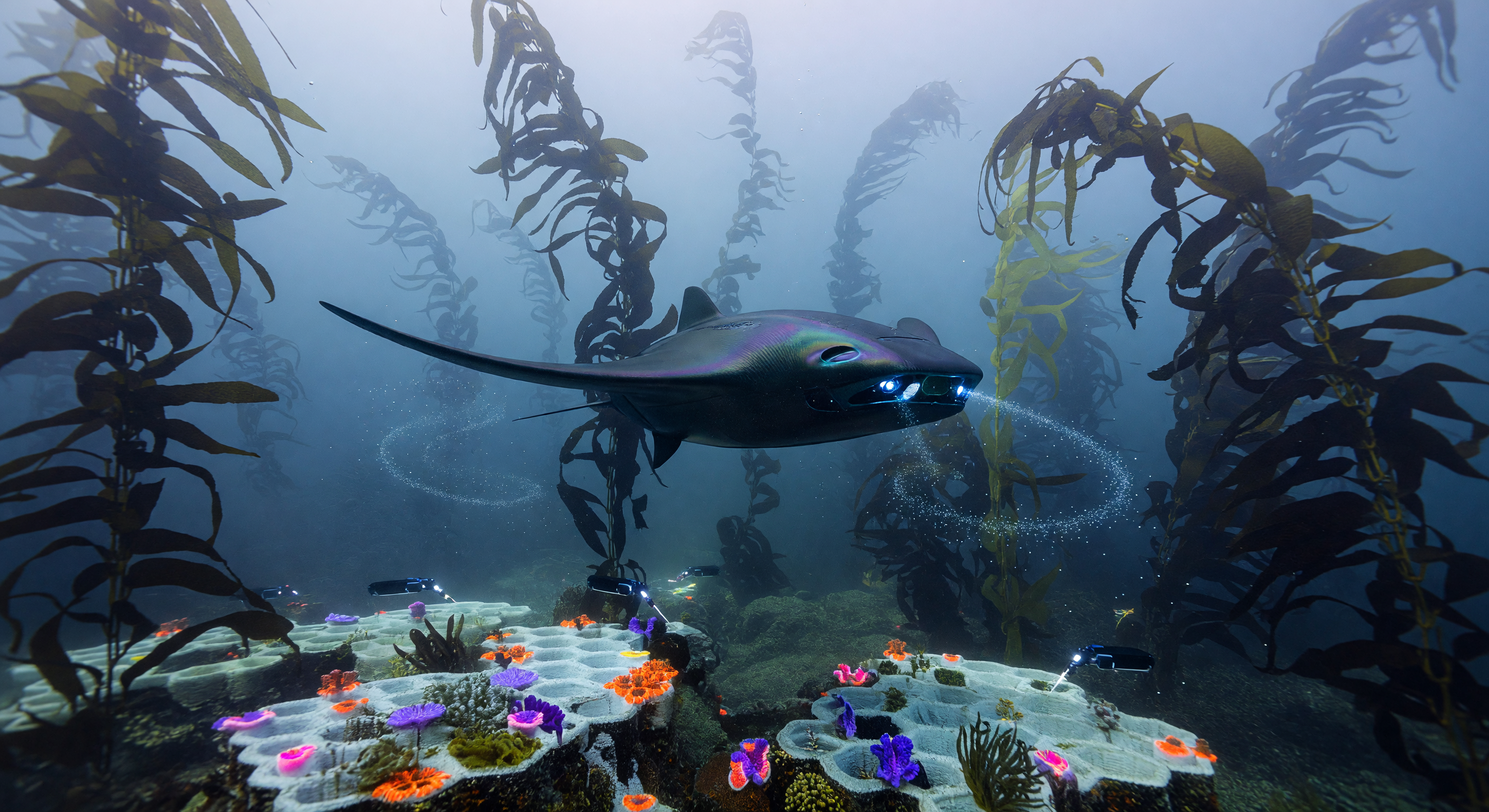 The image is visually compelling and broadly consistent with a near-future managed marine ecosystem in the North Pacific. The central drone is notably manta ray-shaped rather than torpedo-shaped as GPT described — this is actually a more sophisticated and plausible design choice for a biomimetic patrol drone of the 2025-2050 period, and deserves recognition as a thoughtful detail. The kelp forest background is recognizable as Macrocystis-type giant kelp, which is appropriate for the North Pacific. The seafloor features white honeycomb-textured structures that genuinely do suggest 3D-printed or ceramic-latticed artificial reef substrate — more so than GPT acknowledged — though the brightly colored coral-like organisms (vivid orange, purple, pink) look more tropical/fantastical than what one would expect from engineered heat-resistant corals adapted to North Pacific conditions, which would likely be less flamboyant. Several smaller ray-shaped drones are visible on the seafloor, and there are swirling particulate trails from the main drone that could plausibly represent 'Smart Dust' sensor deployment, though this is ambiguous.