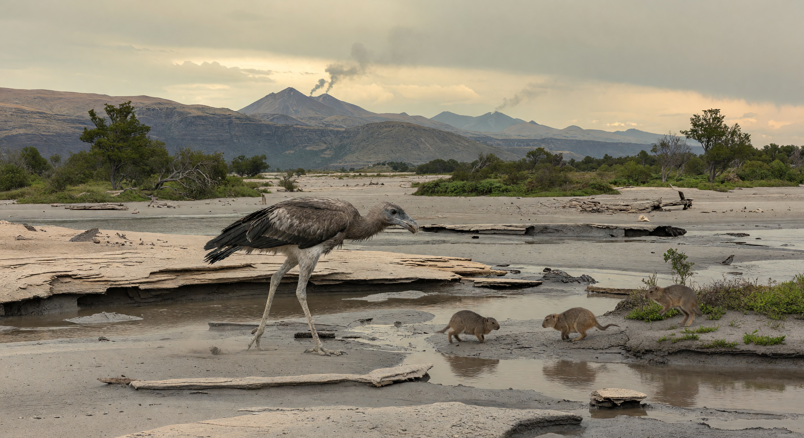 No fim do Eoceno, há cerca de 37–34 milhões de anos, uma ave do terror (Phorusrhacidae) com quase 1,8 metro de altura avança por uma planície aluvial da Patagónia coberta de cinzas, observando pequenos Notostylops, ungulados nativos do grupo dos notoungulados, do tamanho de um coelho. Em redor, margens lamacentas, canais rasos e bosques esparsos de Nothofagus estendem-se até aos vulcões fumegantes dos proto-Andes, num cenário moldado por cinzas, lamas e atividade tectónica. Esta cena retrata um mundo sul-americano ainda isolado, onde predadores aviários gigantes ocupavam nichos de grandes caçadores muito antes de os mamíferos carnívoros modernos dominarem estas paisagens.