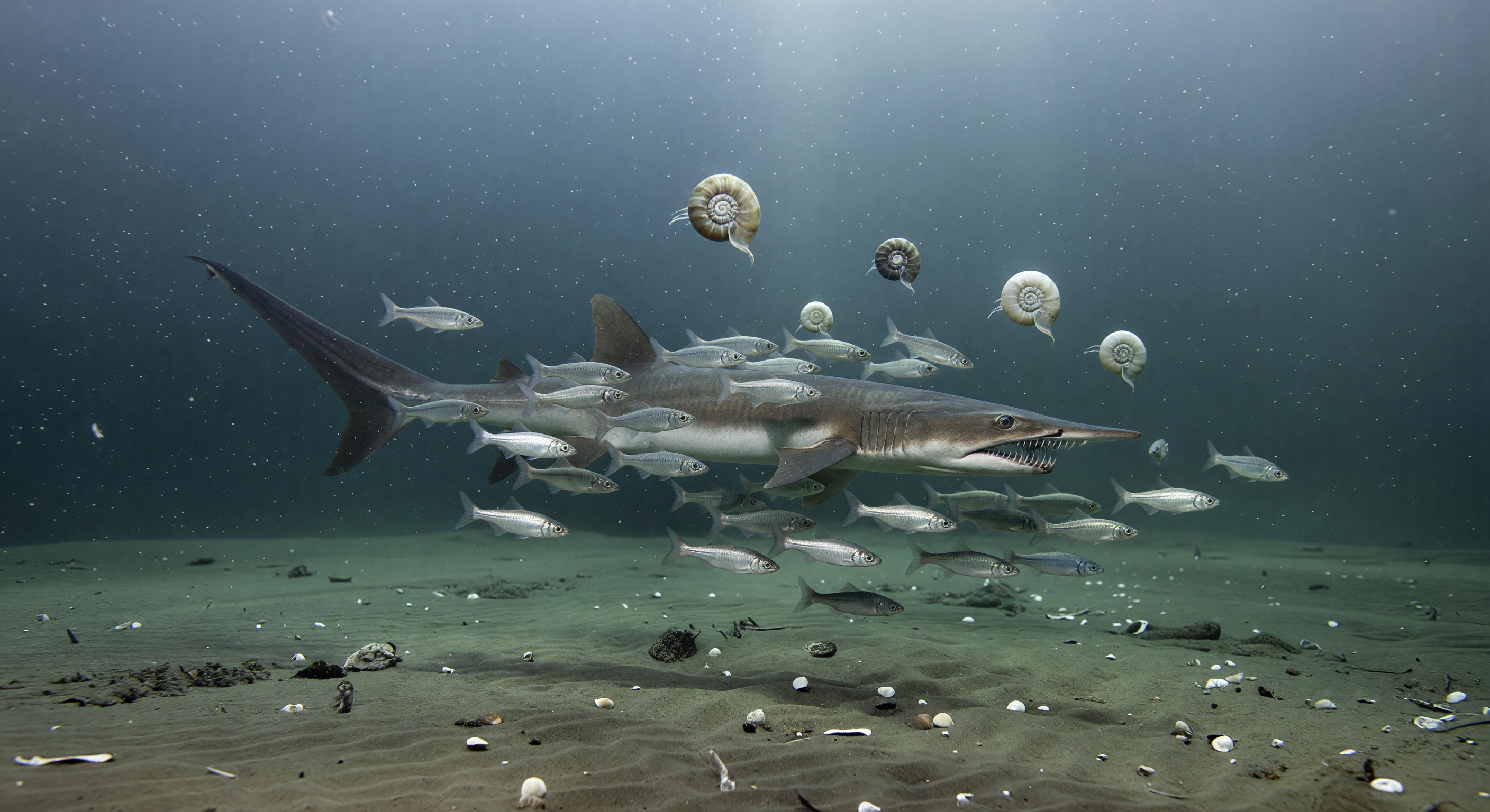 - English: Helicoprion chasing fish and ammonoids in polar Permian waters