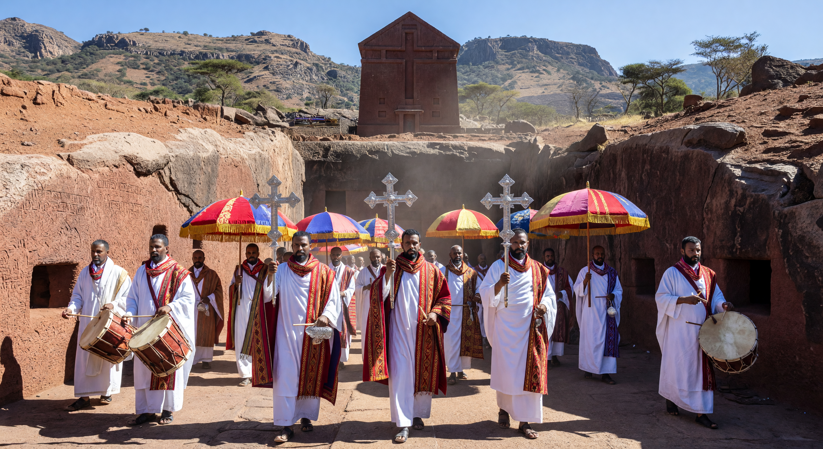 IMAGE ISSUES identified by the committee: 1) The clergy garments look too clean, uniform, and modern, with machine-like consistency and crisp embroidery rather than the texture of hand-spun, hand-loomed cotton. 2) The red patterned sashes/capes read as contemporary or highly polished rather than plausibly 16th-century. 3) The processional umbrellas are too saturated, shiny, and stylized, resembling modern ceremonial textiles or synthetic fabrics. 4) The silver processional crosses are overly polished and modern-looking, closer to contemporary replicas than period-appropriate metalwork. 5) The drum finishes and performance props also look too modern and polished for a 16th-century rendering. 6) The overall scene has insufficient historical patina, making it look like a present-day reenactment rather than a Renaissance-era scene. 7) The image does not reflect the likely turbulence and hardship of the 16th century in Ethiopia; the visual condition of the regalia feels too pristine for that period. 8) The architecture and geology are accurate, but the image’s polish makes the period assignment visually under-supported.