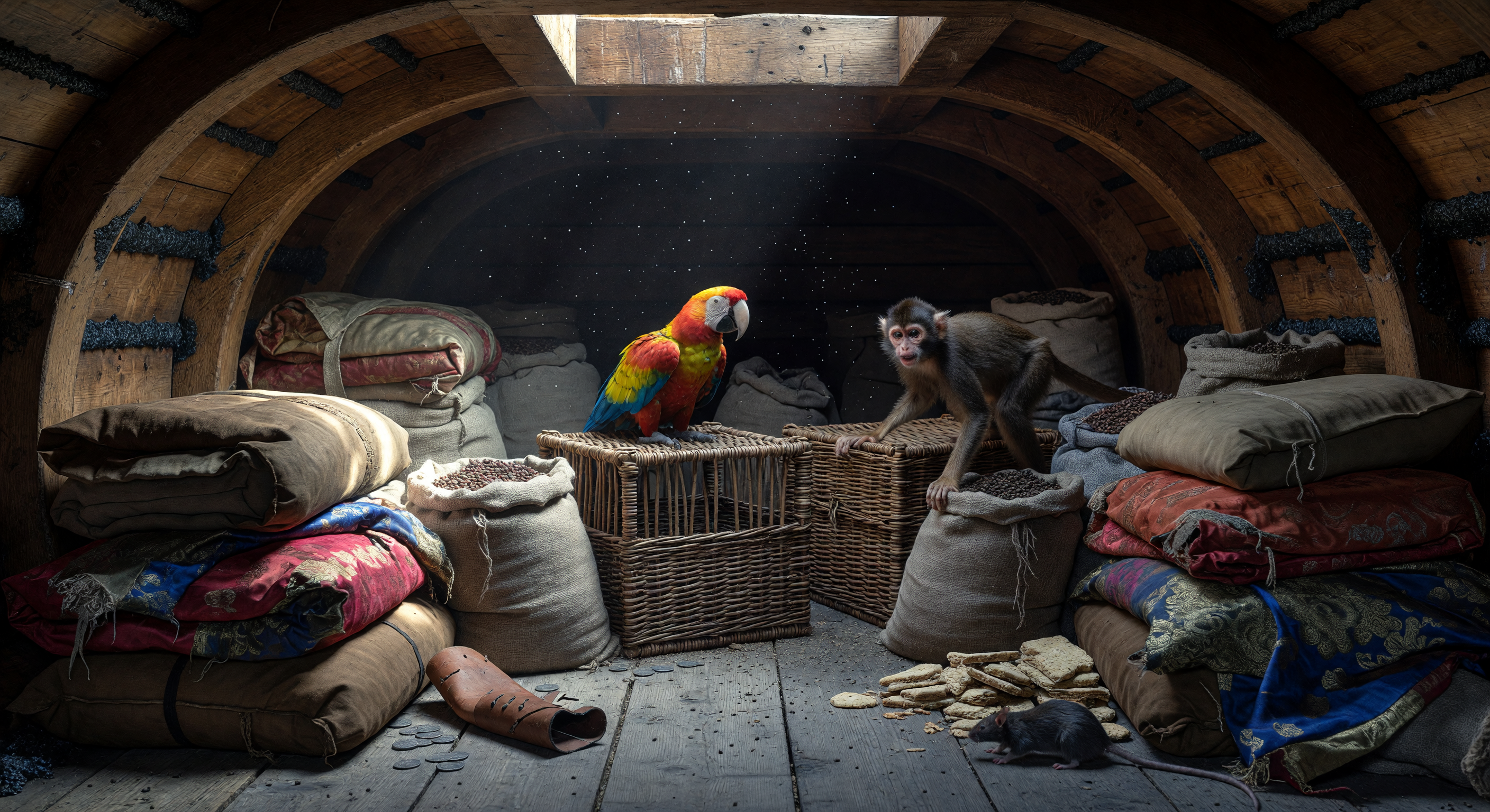 This scene depicts the claustrophobic hold of a 16th-century merchant vessel, where a Scarlet Macaw and a spider monkey are transported alongside precious cargoes of Ming Dynasty silk and black pepper. During the Renaissance, the "Great Convergence" turned the world’s oceans into global highways, facilitating the exchange of exotic species and luxury commodities between the Americas, Asia, and Europe. The presence of silver "Pieces of Eight" and humble sea biscuits amidst these riches highlights the stark contrast between the immense wealth of the era’s maritime trade and the grueling, damp conditions endured by all living things on board.