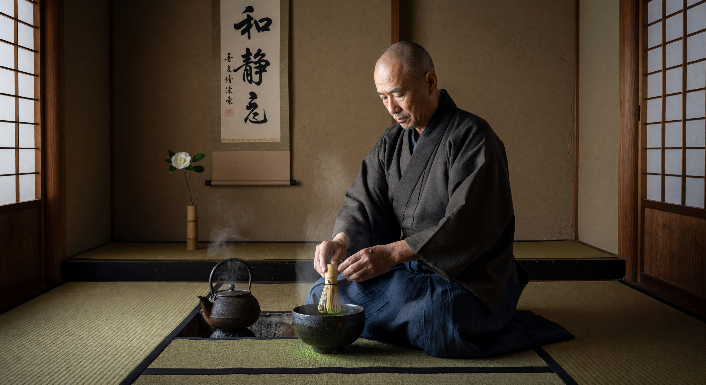 The image is highly accurate and plausible for a 16th-century Japanese tea ceremony in a Kyoto tea room during the late Sengoku/Momoyama period. Key elements include tatami mats, shoji screens with diffused light, a tokonoma alcove with a hanging calligraphic scroll (readable characters evoke harmony/quietude, fitting Zen tea aesthetics), a sunken hearth (ro) with steaming tetsubin iron kettle, bamboo chasen whisk, dark hand-thrown chawan bowl with matcha foam, and a simple bamboo vase with a single white camellia flower (chabana style, seasonally appropriate for winter/early spring in Kyoto). The tea master's shaved head, dark kosode-style kimono (subdued kosumode fabric, layered with blue hakama-like lower garment), and kneeling seiza posture align with Zen monk practitioners like Sen no Rikyu. No anachronisms detected—materials, architecture, and composition reflect wabi-sabi minimalism without modern intrusions. Visual coherence is excellent, with soft lighting and rustic imperfections enhancing authenticity.