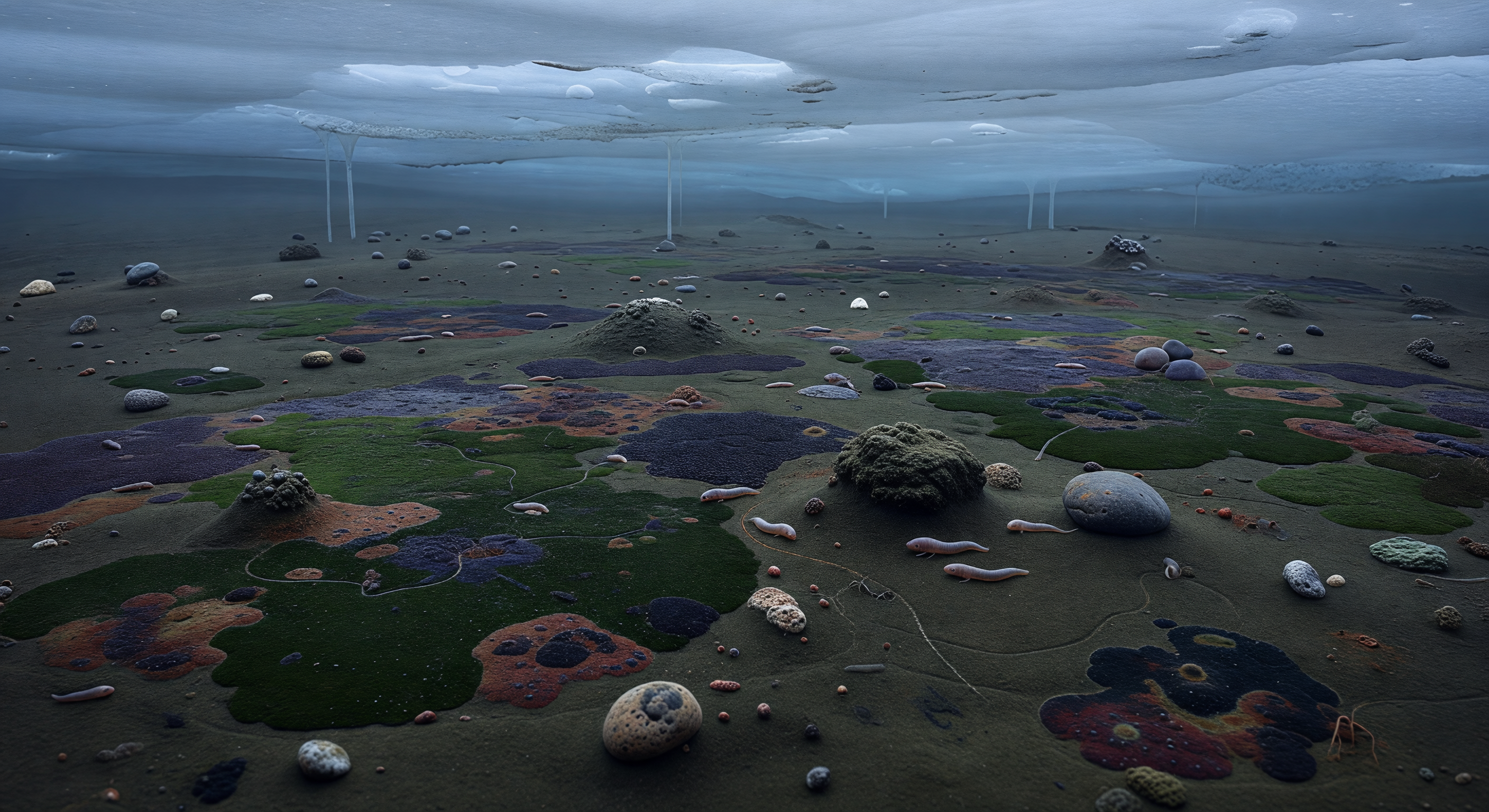 The image effectively captures the dim, sub-ice seafloor environment of a Cryogenian Snowball Earth scenario (720–635 Ma), with a continuous ice roof overhead, fine mud sediments, scattered dropstones (plausibly ice-rafted debris), and microbial mat-like colorful patches (purples, greens, oranges) across the seafloor. Small mound structures align with possible thrombolites, and the overall lighting is appropriately low and blue-toned for a near-freezing, light-limited setting. No anachronisms like modern life, technology, or flora/fauna are present, and the geology (dropstones, sediment) is visually coherent and scientifically plausible. However, prominent macroscopic worm-like organisms (elongated, segmented white forms crawling on the sediment) are a significant issue; while trace fossils or subtle bilaterian activity are debated for late Cryogenian refugia, visible soft-bodied worms are anachronistic and unsupported by the fossil record, which shows convincing bilaterians only post-635 Ma in the Ediacaran. The vivid, artificial color palette of mats also leans artistic rather than muted/realistic for anoxic, low-light microbial communities. These warrant prompt refinement to remove worms, tone down colors, and emphasize microbial textures/ambiguous traces for accuracy.