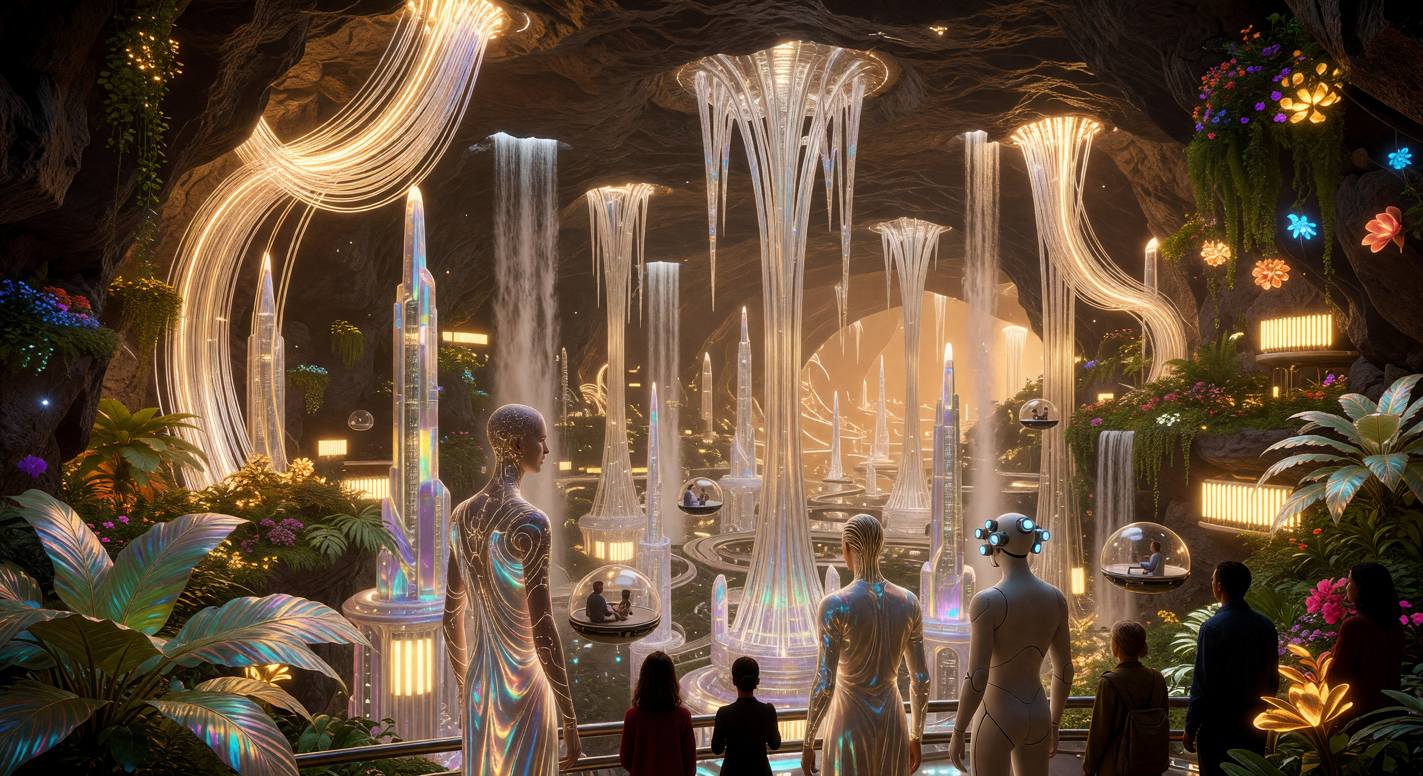 The image effectively captures a speculative future lunar lava tube habitat with visually coherent elements: rugged cave walls suggesting basaltic geology, arcing golden light streams evoking fiber-optic sunlight channeling, towering iridescent spire-like structures that could pass for 3D-printed organic skyscrapers in 1/6g (elongated, lightweight forms), lush greenery implying bio-engineered flora, and diverse figures including gracile, elongated humanoids in sleek attire and a shiny synthetic entity, aligning with low-gravity adaptation and Type 1.5 civilization diversity. The amber lighting and metallic sheen add a plausible 'rewilded' interior glow. However, scientific issues persist: the cascading waterfalls on the spires flow too dynamically and vertically for 1/6 gravity, where water would form slower, bulbous sheets or require containment to avoid evaporation/freezing in a sealed habitat; tropical Earth-like plants (ferns, broad leaves) feel insufficiently alien for 'bio-engineered' adaptations; and the scene lacks overt lunar specifics like regolith dust, airlock hints, or structural bracing against seismic stresses, making geology generic rather than Tycho-specific (nearby basalts but no unique craters/maria cues). No major anachronisms, but visual plausibility strains under lunar physics scrutiny.