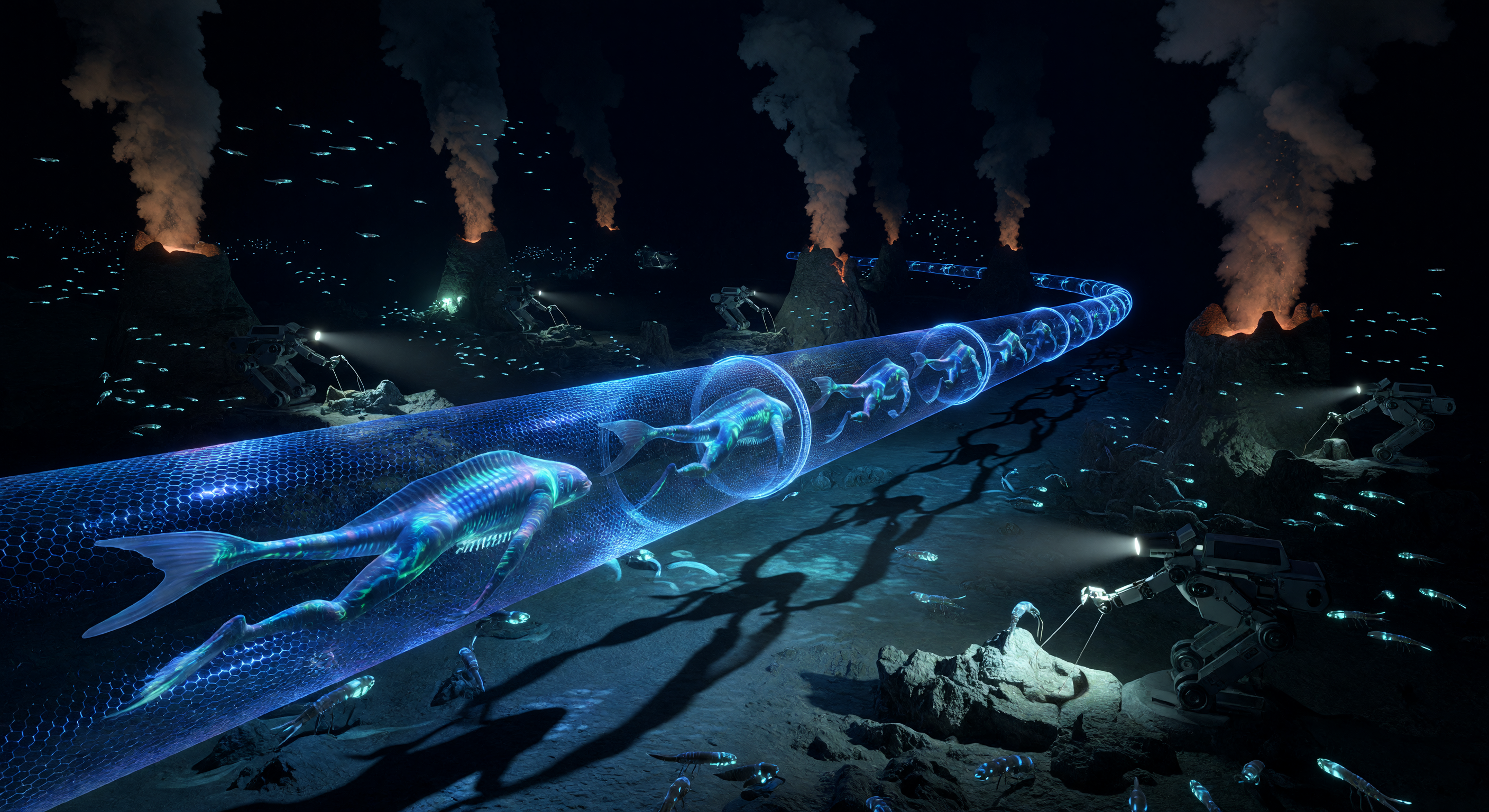 Image issues identified by the committee: 1) The Hydro-Tube is visually ambiguous and reads more like an organic, bioluminescent, eel-like conduit or symbiote than a clearly mechanical transit system. 2) The scene does not clearly communicate mag-lev functionality: there are no visible rails, suspension elements, propulsion interface, docking points, or other unambiguous transport hardware. 3) The tube’s hexagonal mesh and enclosed lifeforms make the structure feel biological rather than engineered infrastructure. 4) The large aquatic figures inside the tube are visible, but the image does not clearly show them as passengers in a transit system; they could be interpreted as creatures or cargo. 5) Scale is somewhat unclear relative to the vents and robots, reducing clarity of the intended industrial/civilizational function. 6) The overall aesthetic leans strongly biopunk, which slightly undercuts the caption’s more technological emphasis.