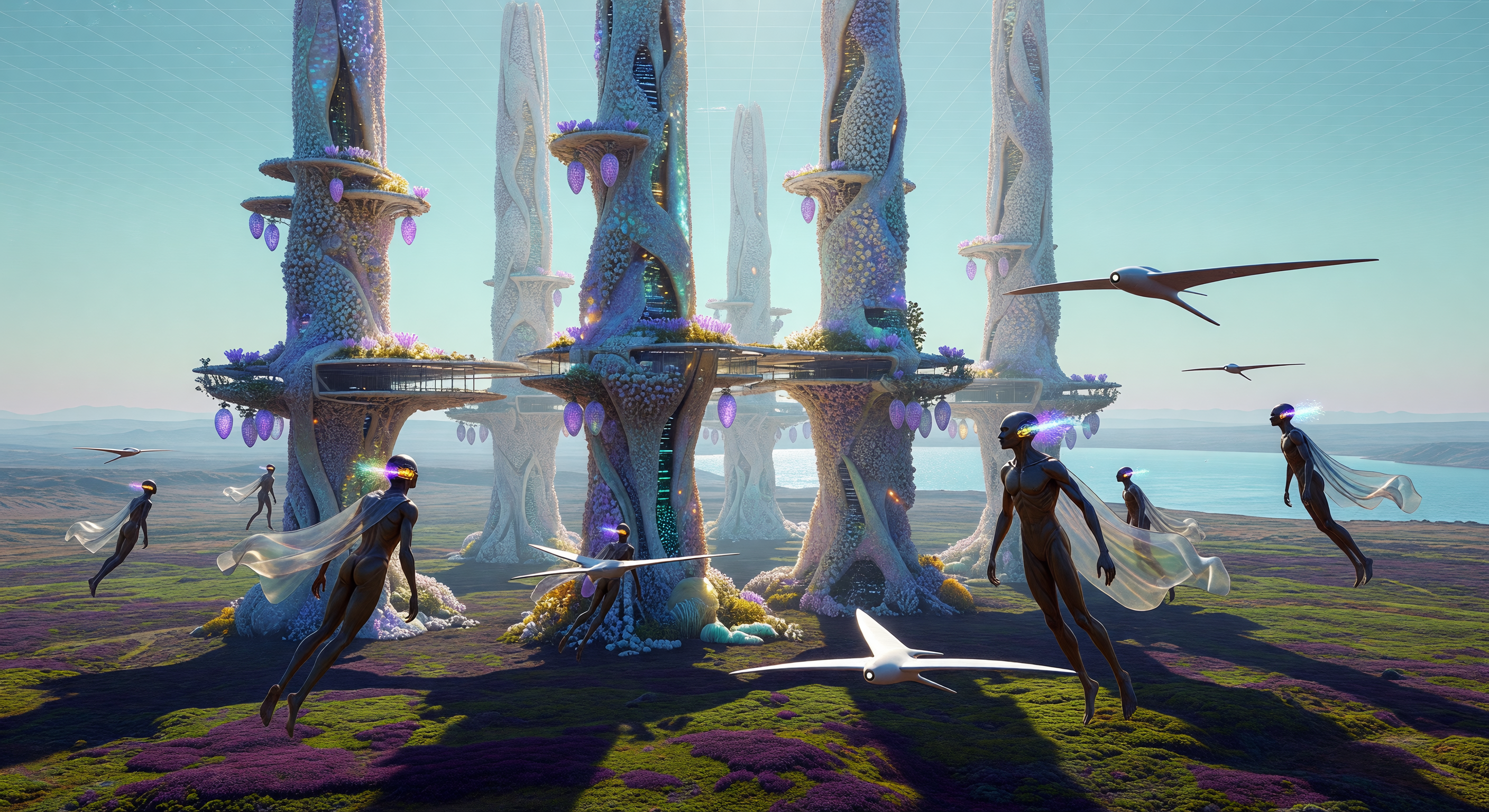 In the lush atmosphere of a terraformed Mars (c. 2500–3000 CE), genetically optimized *Homo martians* and sleek Noosphere-Walker proxies glide between the five-kilometer-high, bio-engineered coral-silicate spires of the Tharsis City-Complex. Utilizing translucent aero-capes to navigate the planet’s 0.38g gravity, these 2.5-meter-tall inhabitants communicate via synesthetic neural bursts above a landscape transformed by the emerald "Great Rust-Bloom" moss and the azure waters of the Valles Sea. This vibrant biosphere, protected from solar radiation by an orbital magnetic shield, represents the pinnacle of late-millennium planetary engineering and post-human evolution.