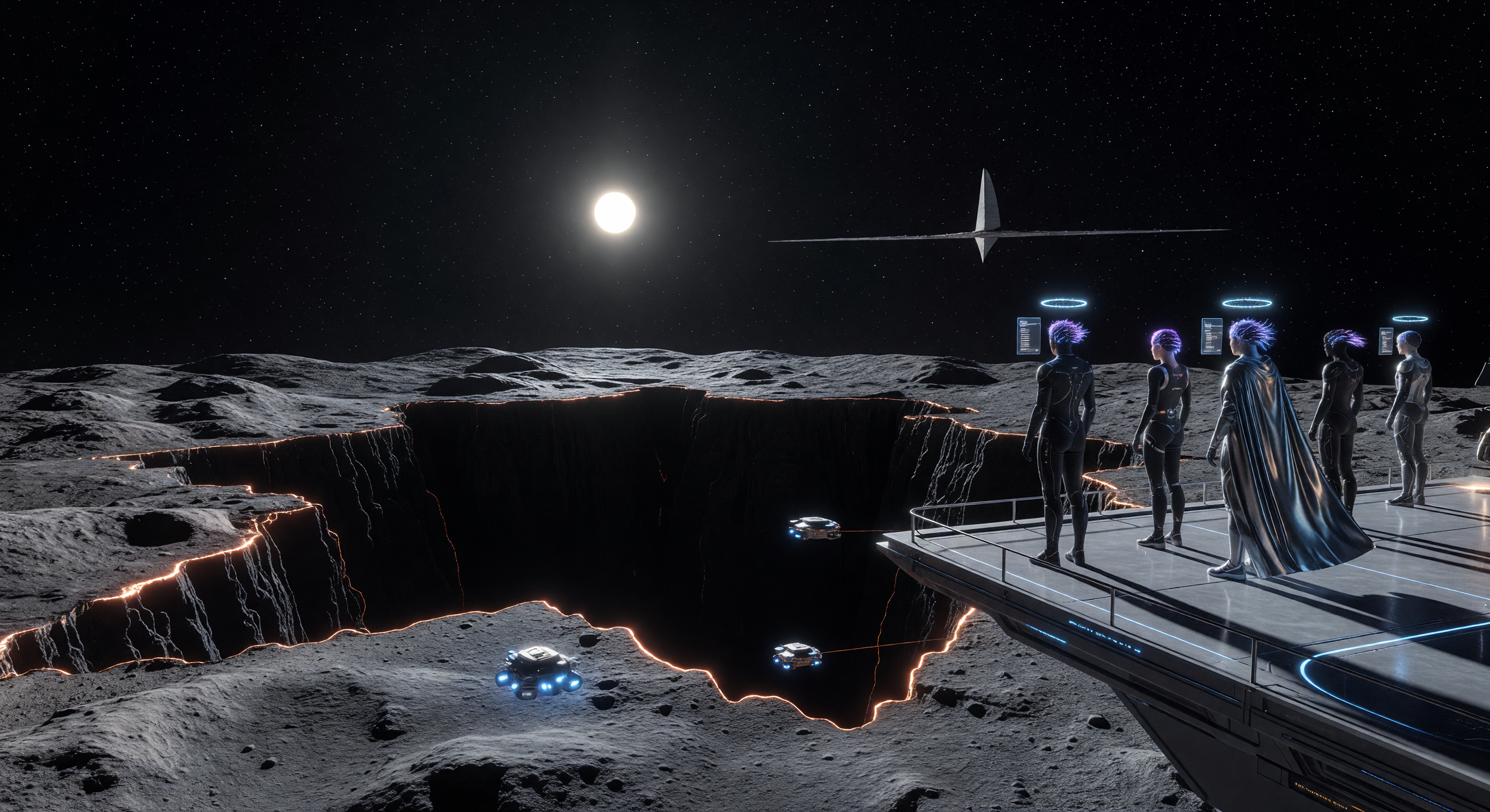 Paragraph 1: The committee agrees the image is broadly coherent as a hard-vacuum sci-fi scene: it clearly shows an airless body with stark lighting, a dramatic engineered chasm, industrial/spacefaring infrastructure, and post-human fashion styling that fits the Solar Expansion aesthetic. The image also successfully suggests recent high-energy excavation and an arts/culture presentation on a celestial surface.