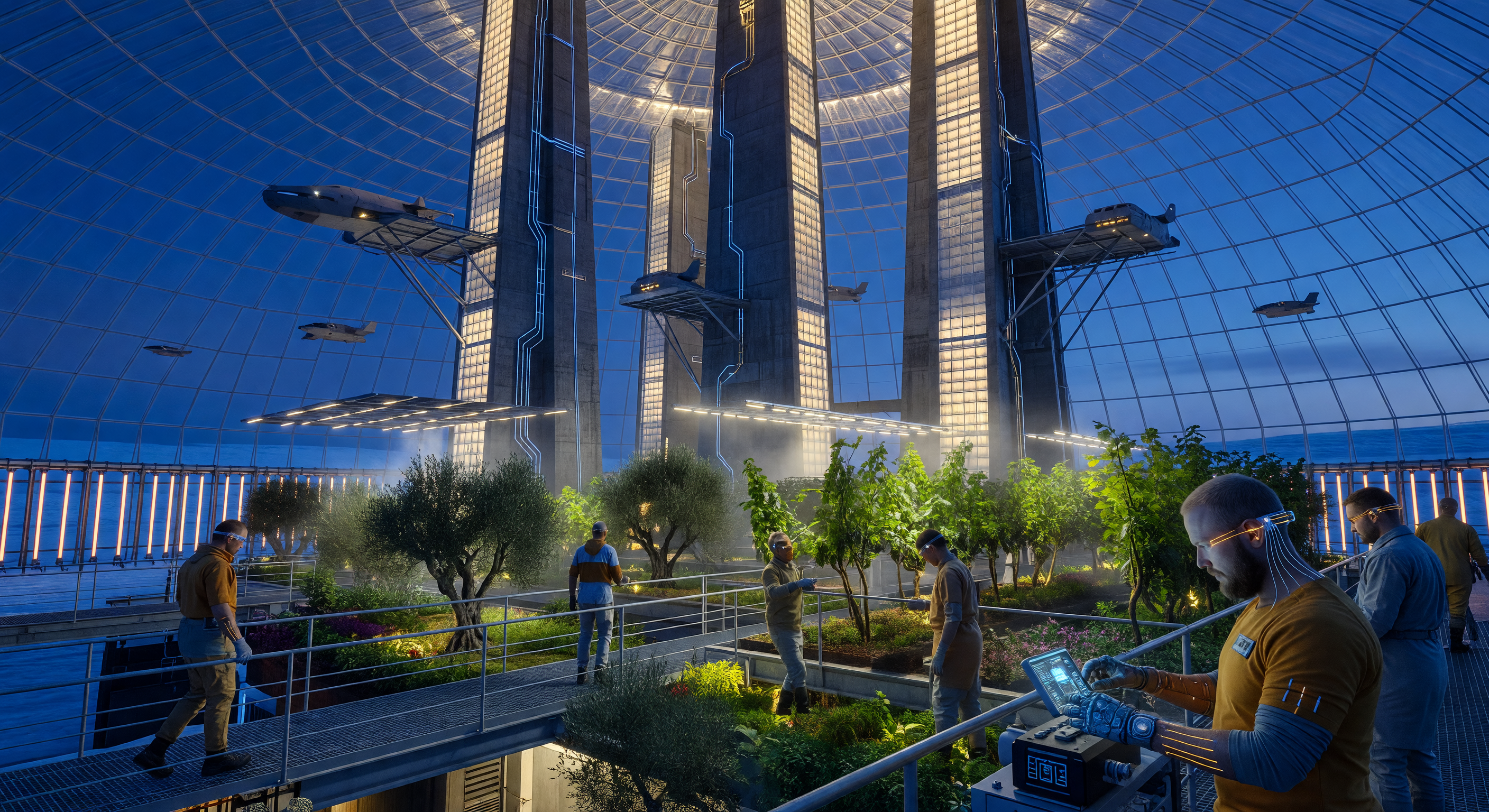 The image effectively captures a speculative late-21st-century vision of a controlled microclimate in Norilsk, with a large dome enclosing terraced gardens of olive trees and grapevines—scientifically plausible under artificial lighting and climate control in Arctic Siberia, where such subtropical crops could thrive indoors despite the permafrost and extreme cold outside. The neo-constructivist monoliths with glowing conduits evoke a culturally appropriate evolution of Soviet brutalism for an Eurasian Federation, and the social stratification is visually strong: augmented figures with neural headsets and prosthetics (Vanguards) oversee unaugmented workers (Solidarists) in practical clothing, aligning with the 'Augmented Dawn' theme. VTOL-like aircraft on tower platforms add high-tech plausibility, and the overall composition is coherent and immersive. However, the dome appears as a smooth geodesic or rectilinear grid rather than a distinct hexagonal lattice; the exterior vista is an abstract cobalt-blue gradient resembling a seascape more than Norilsk's rugged, snow-covered tundra with industrial scars; and lighting sources are broad panels/towers, not filament-specific. No major anachronisms, but these mismatches and lack of regional tundra details (e.g., rocky outcrops, mining infrastructure) warrant refinement for precision.