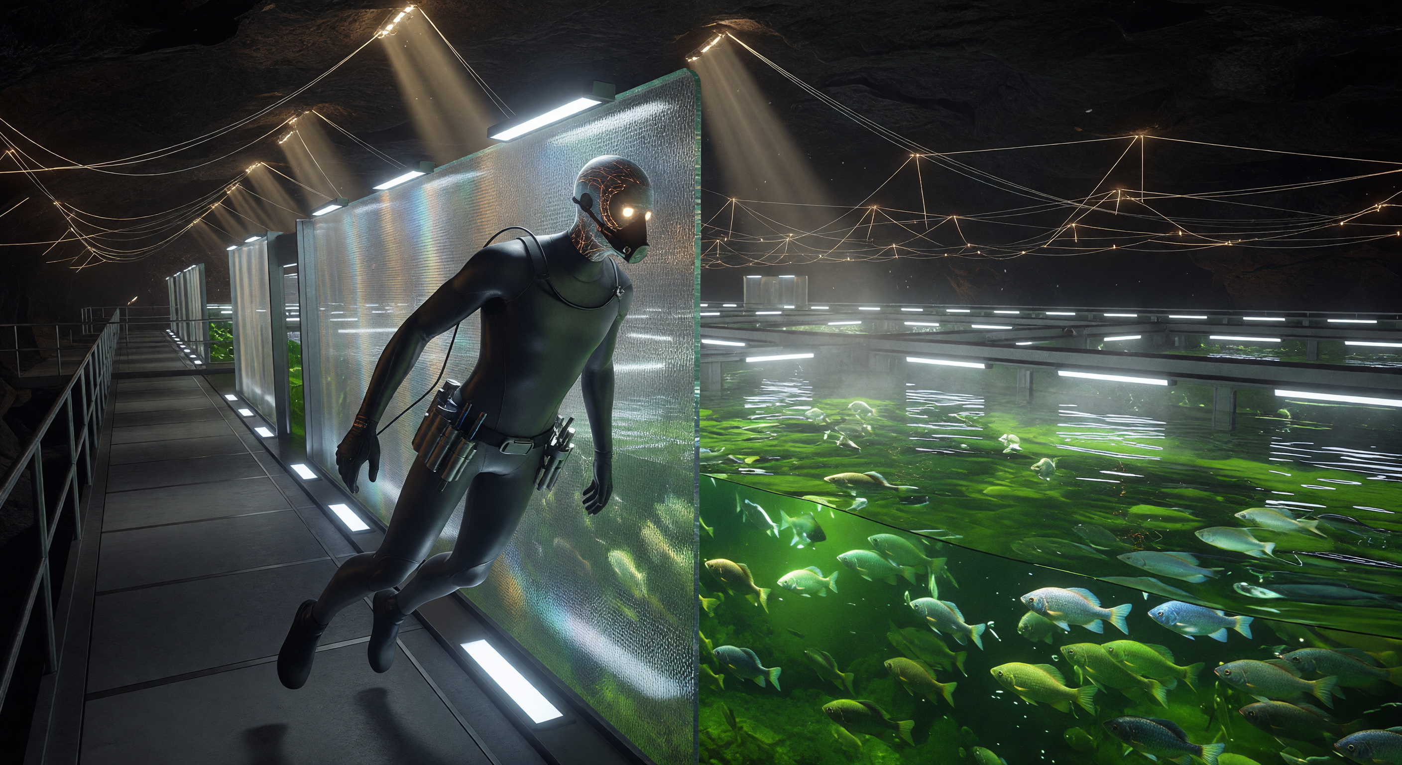 The image effectively captures a plausible subterranean maintenance bay on Colonial Mars during the Convergence era (210–220 CE). The rough regolith ceiling, strung industrial lighting, and translucent carbon-nanotube-like wall panels align with advanced, utilitarian architecture for a pressurized Martian habitat in Hellas Planitia, a real deep basin suitable for subsurface colonies. The massive glowing green aquaculture tanks teeming with fish and bioluminescent algae visually convey a self-sustaining ecosystem for oxygen and protein production, with the fish resembling modified tilapia in body shape amid the green water. The Augmented diver's sleek black exosuit, helmet with possible neural-mesh glow, tool belt, and subtly elongated limbs suggest low-gravity adaptations and technological augmentation, posed dynamically while inspecting the wall from a walkway—coherent and free of anachronisms in this speculative future context. Scientifically, the .38g environment is implied through the figure's proportions and the facility's design, with no major geological or biological implausibilities.