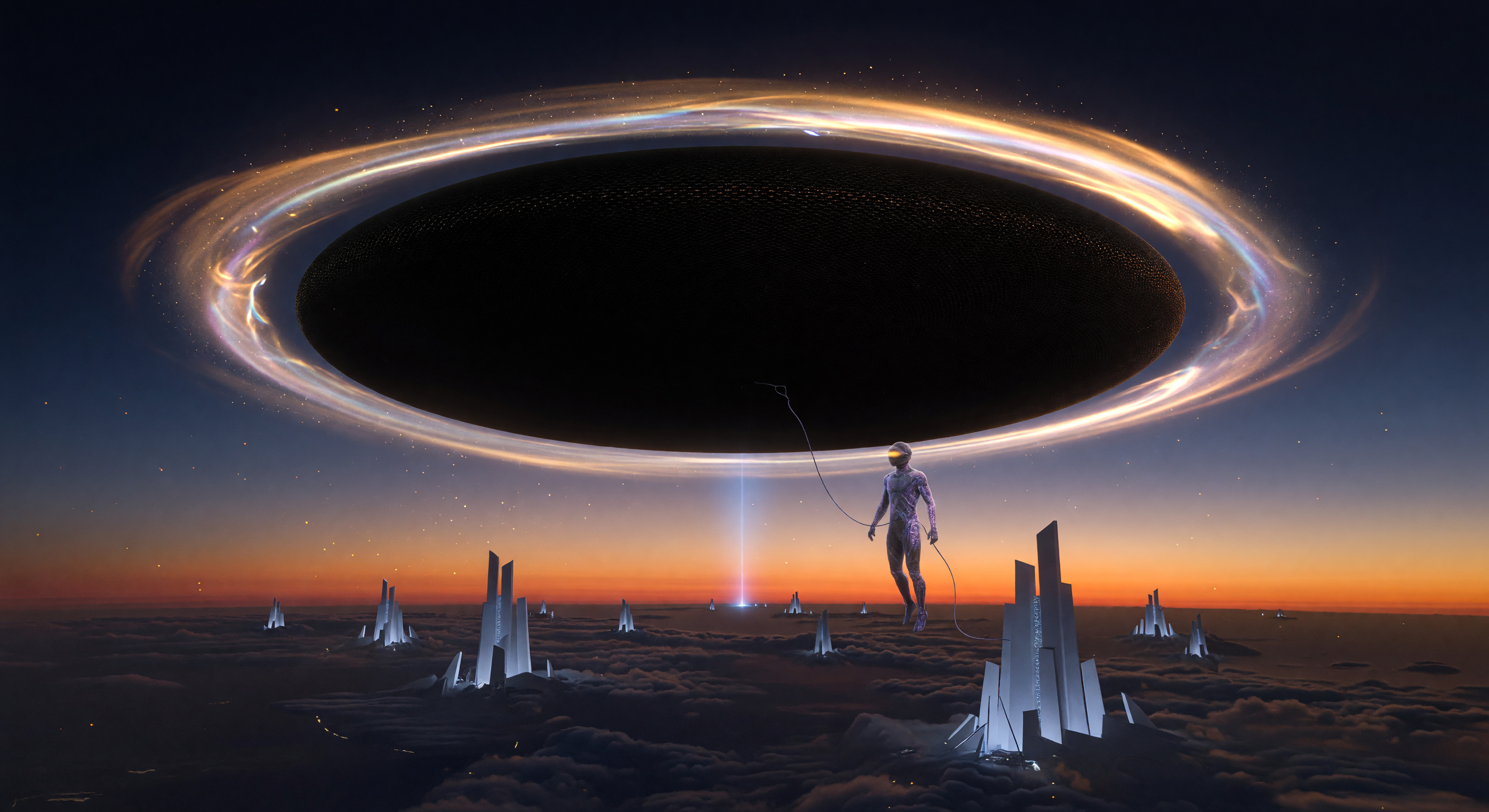 The image captures the scale and ambition of 22nd-century geoengineering effectively, with the 'White Towers' and the bio-integrated technician providing a tangible sense of future technology. However, the 'Obsidian Disc' is visually indistinguishable from a black hole's event horizon and accretion disk. For a transport vessel using an Alcubierre drive, the visual should emphasize an engineered structure rather than an astrophysical phenomenon. The 'gravitational lens' as depicted is also scientifically inaccurate; a warp bubble would cause complex optical refraction and Doppler shifting (blue/redshifting) of the surrounding environment, not a static, fiery ring of glowing matter. I recommend adjusting the prompt to give the vessel discernible hull features and to render the lensing effect as a distortion of the background sky rather than a glowing ring.