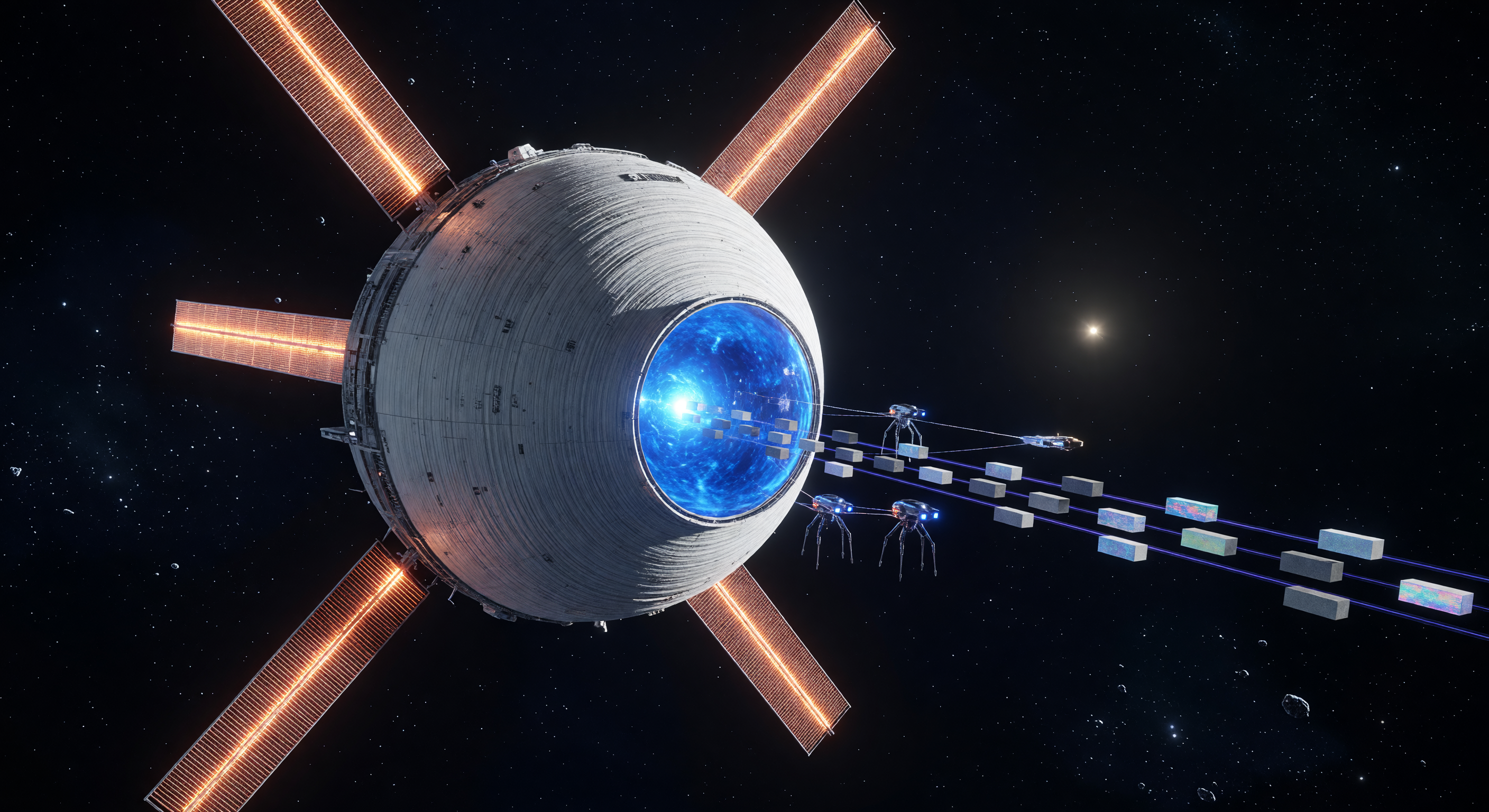 Paragraph 1: The committee broadly agrees that the image is a coherent far-future deep-space industrial scene: a large matte-white/silvery orbital structure, orange-glowing fin-like extensions, a bright blue core/aperture, non-humanoid drone workers, and geometric cargo blocks on tracks all visually support the Galactic Age / Inventions & Technologies theme. The background starfield and distant bright star also plausibly fit an Oort Cloud setting.